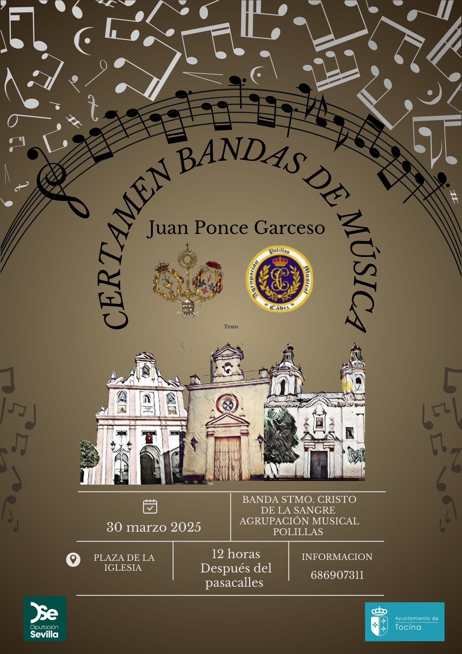 La Delegación de Cultura del Ayuntamiento de Tocina ofrece al municipio un certamen de bandas de marchas procesionales el próximo domingo 30 de marzo en la plaza de la iglesia de Tocina (Pza. de la Constitución) a partir de las 12 h.