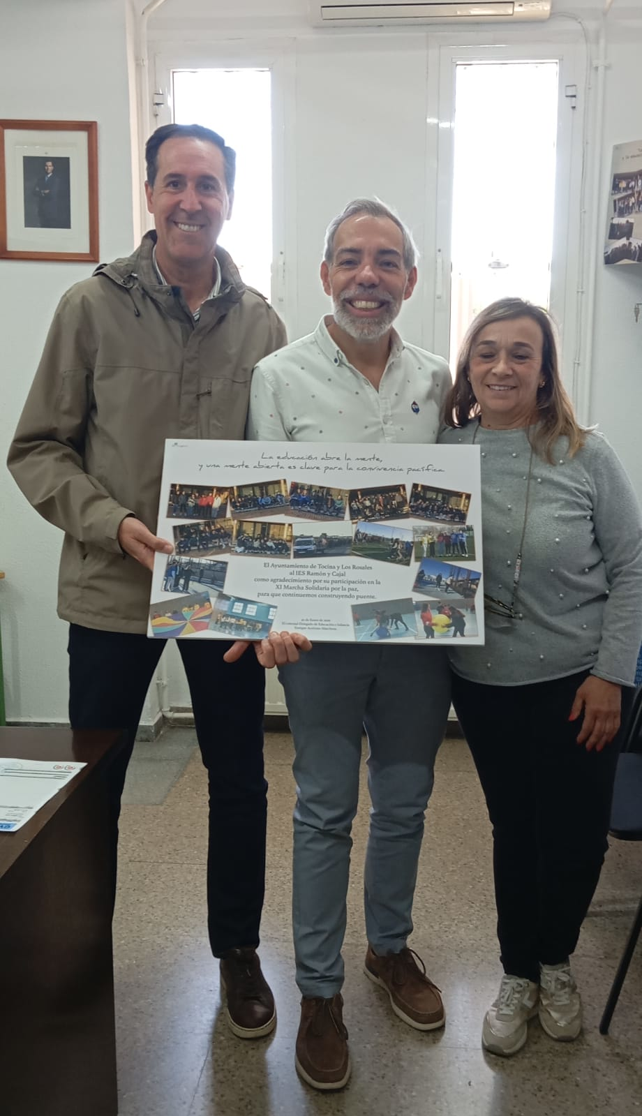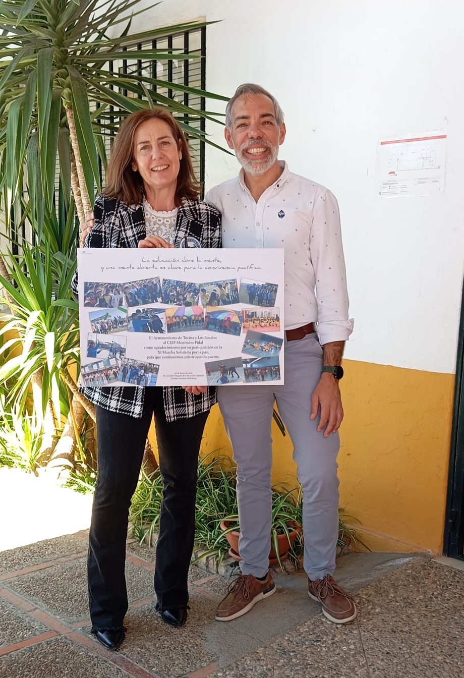 El Ayuntamiento de Tocina ha hecho entrega a Marta Moreno Baena, directora del CEIP Juan de Mesa de Tocina, a Laura Corral Cano, secretaria del CEIP Menéndez Pidal de Los Rosales, y a Agustín Romero Fernández y Mª Carmen Forte, director y colaboradora de esta actividad del IES Ramón y Cajal, de unas fotografías conmemorativas de la XI Marcha Solidaria de la Paz, que se celebró en el municipio el pasado viernes 20 de enero de 2026, ya que tuvo que ser aplazada por la lluvia.