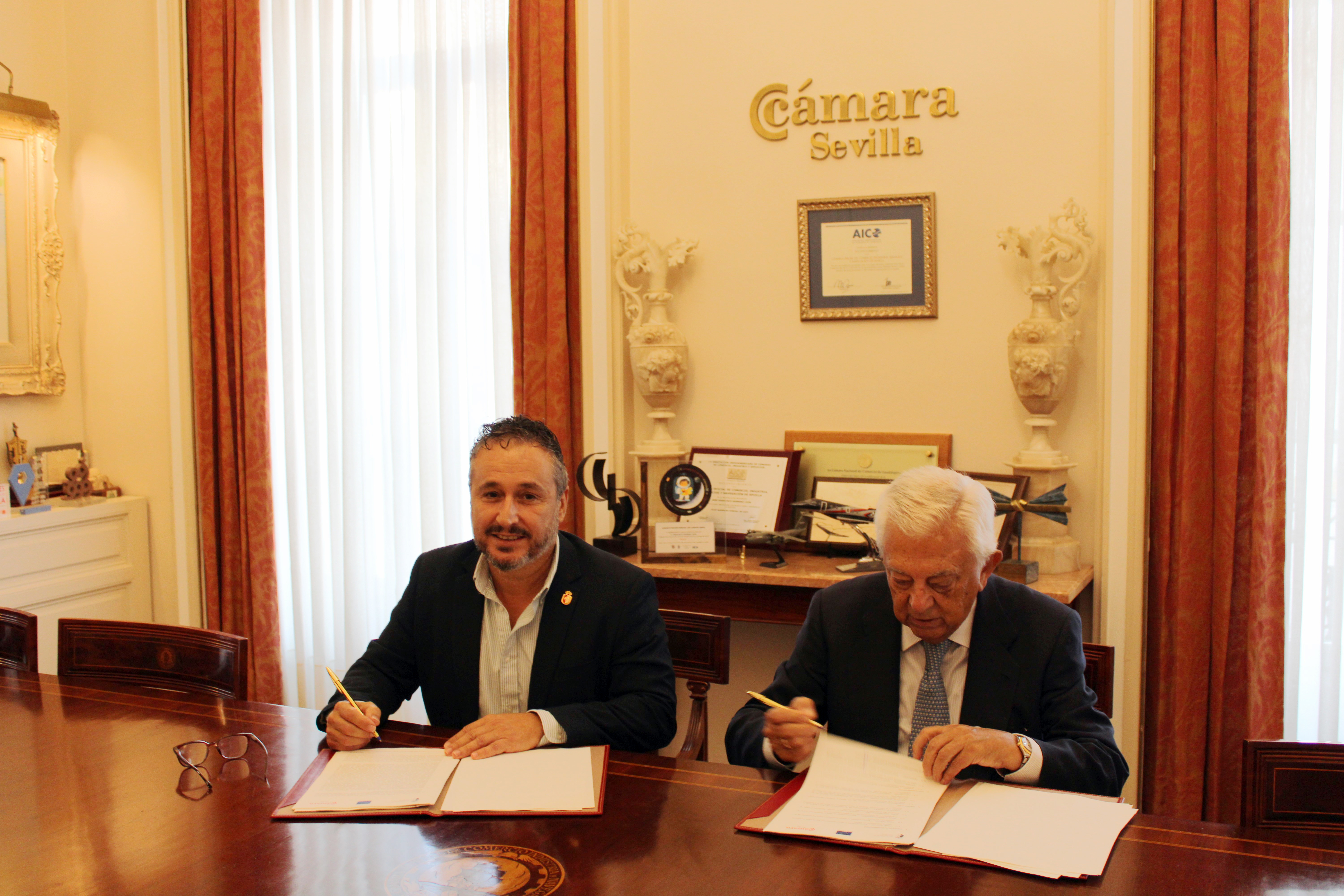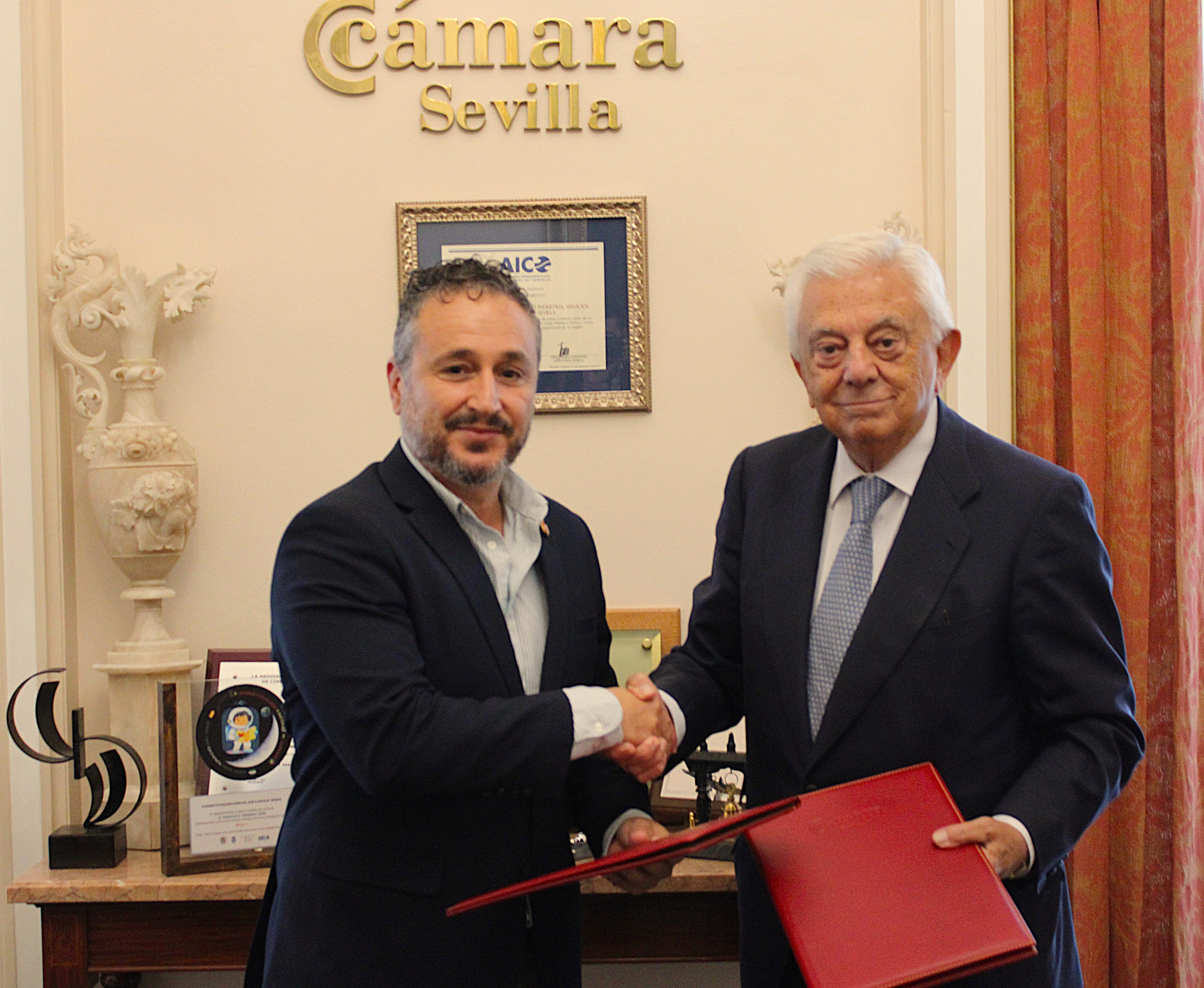 El presidente de la Cámara de Comercio de Sevilla, Francisco Herrero, y el alcalde de Tocina y Los Rosales, Francisco José Calvo, firmaron la pasada semana dos convenios de colaboración con el objetivo de mejorar la contratación pública municipal y poner en marcha programas de apoyo al empleo, el emprendimiento, la competitividad y la internacionalización en el municipio.