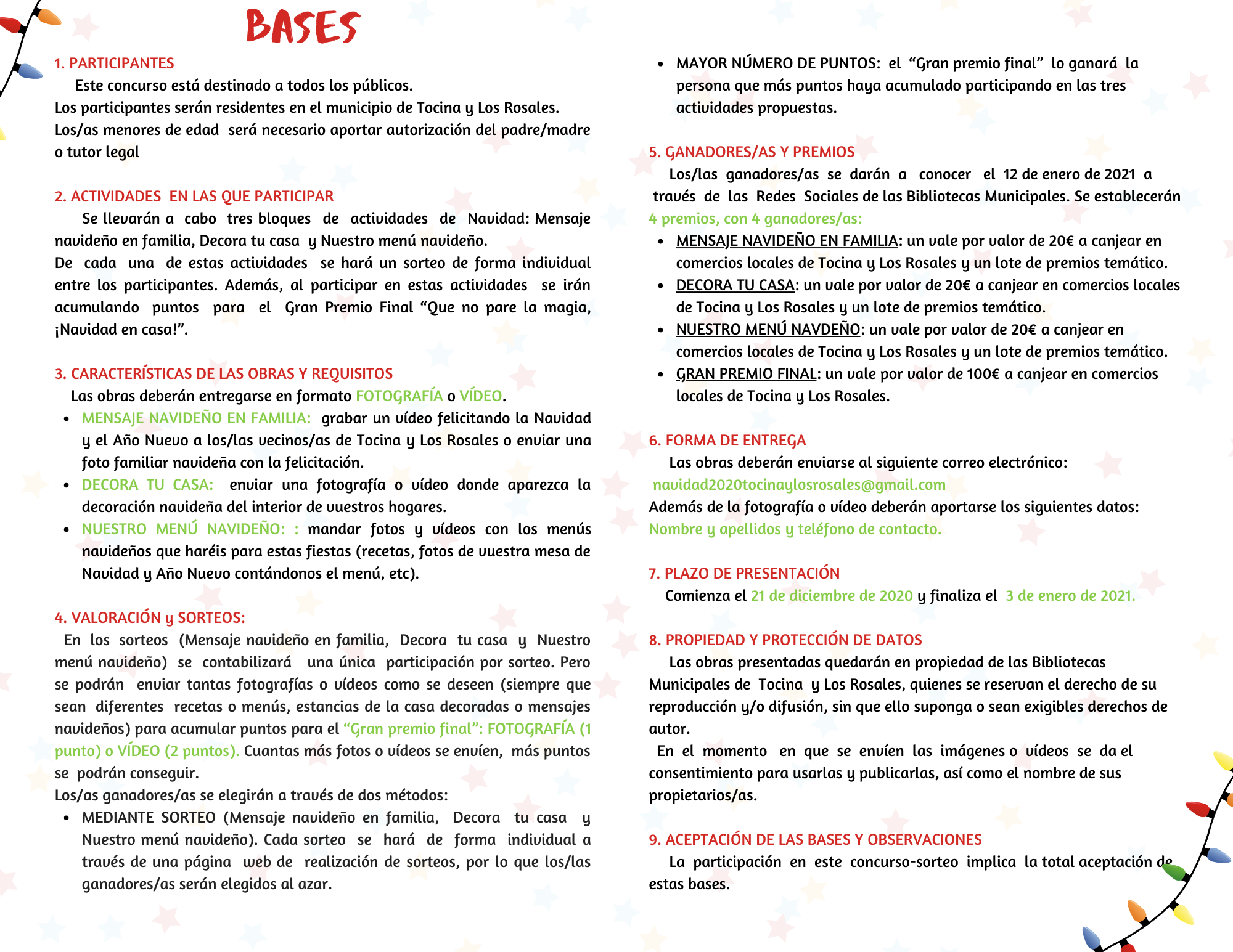 • I Concurso-sorteo “Que no pare la magia, ¡Navidad en casa!” incluye tres bloques de actividades: Mensaje navideño en familia, Decora tu casa y Nuestro menú navideño. De cada una de estas actividades se hará un sorteo de forma individual entre los y las participantes. Además, al participar en estas actividades se irán acumulando puntos para el Gran Premio Final “Que no pare la magia ¡Navidad en casa!”. Puedes consultar AQUÍ las bases. Los/las ganadores/as se darán a conocer el 12 de enero de 2021 a través de las redes sociales de las Bibliotecas Municipales. Se establecerán 4 premios, con 4 ganadores/as: