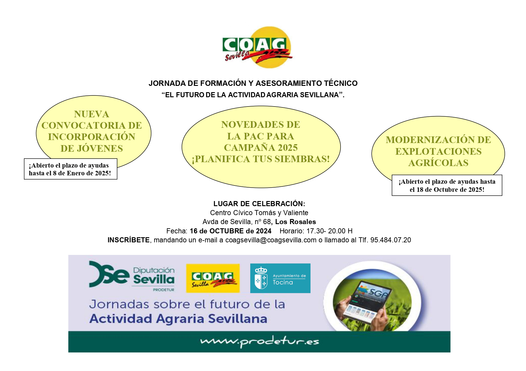 La jornada será impartida por COAG y es organizada por Prodetur (Diputación Provincial) con la colaboración del Ayuntamiento de Tocina.