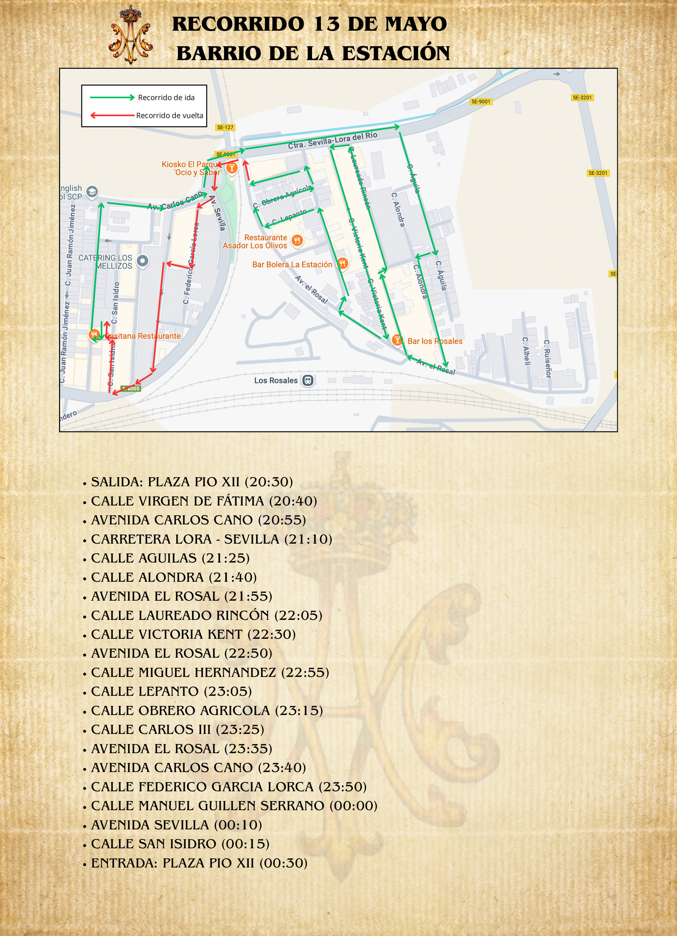 La procesión tendrá el siguiente itinerario: Plaza Pío XII (salida), calles Virgen de Fátima, Av. Carlos Cano, Carretera Sevilla-Lora, Águila, Alondra, Av. El Rosal, Laureado Rincón, Victoria Kent, Av. El Rosal, Miguel Hernández, Lepanto, Obrero Agrícola, Carlos III, Av. El Rosal, Av. Carlos Cano, Federico García Lorca, Pablo Iglesias, Manuel Guillén Serrano, Avd. Sevilla, San Isidro y Plaza Pío XII (entrada).