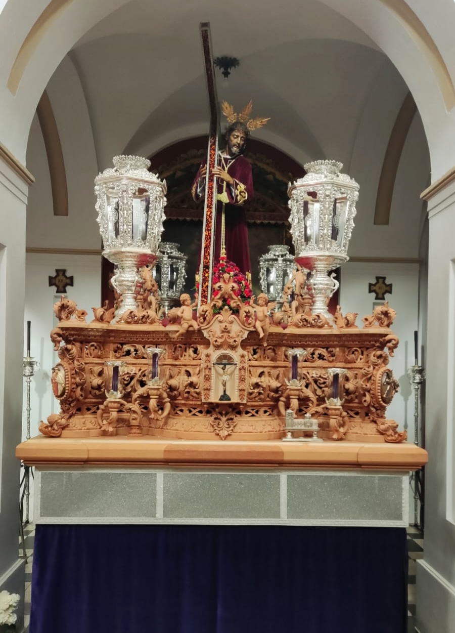 El paso este año estrena canastilla tallada y candelabros de guardabrisas, con cartelas policromadas en las esquinas, los cuatro evangelistas policromados y estofados y cuatro capillas en cada lado del paso con distintos momentos de la pasión.