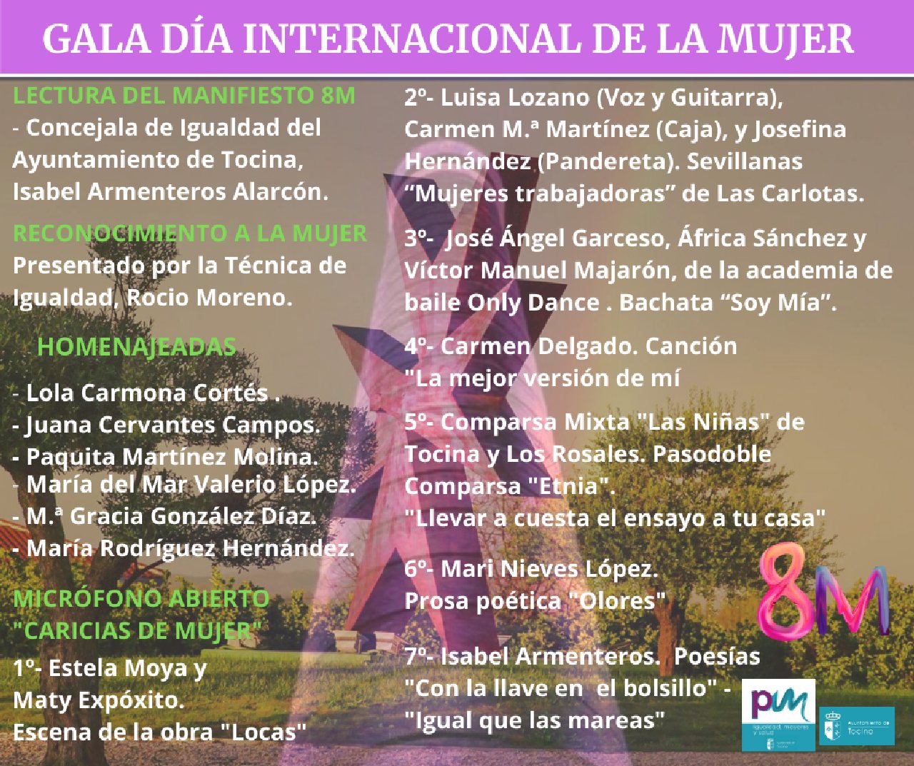 Desde la Delegación de Igualdad del Ayuntamiento de Tocina se quiere agradecer la colaboración de las personas participantes en esta gala, y animar a toda la ciudadanía a que visualice el vídeo que se podrá ver el día 8 de marzo tanto en el canal de youtube de pimtocina como en el facebook.