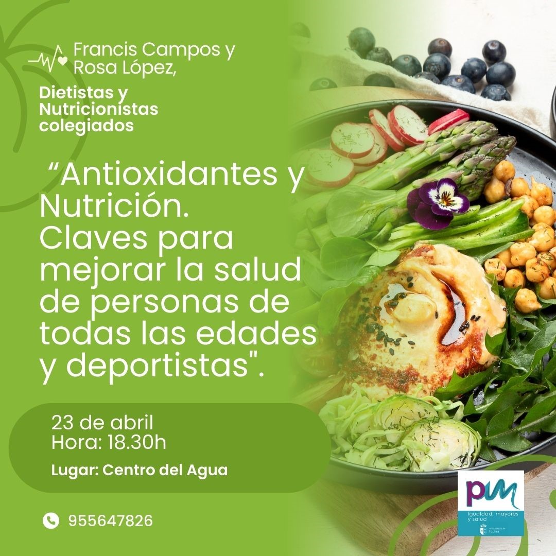 Y por la tarde la charla “Antioxidantes y nutrición. Claves para mejorar la salud de personas de todas las edades y deportistas” tendrá lugar a las 18:30 horas en el Centro del Agua. Será impartida por Francis Campos y Rosa López, dietistas-nutricionistas colegiados. La entrada es libre hasta completar aforo.
