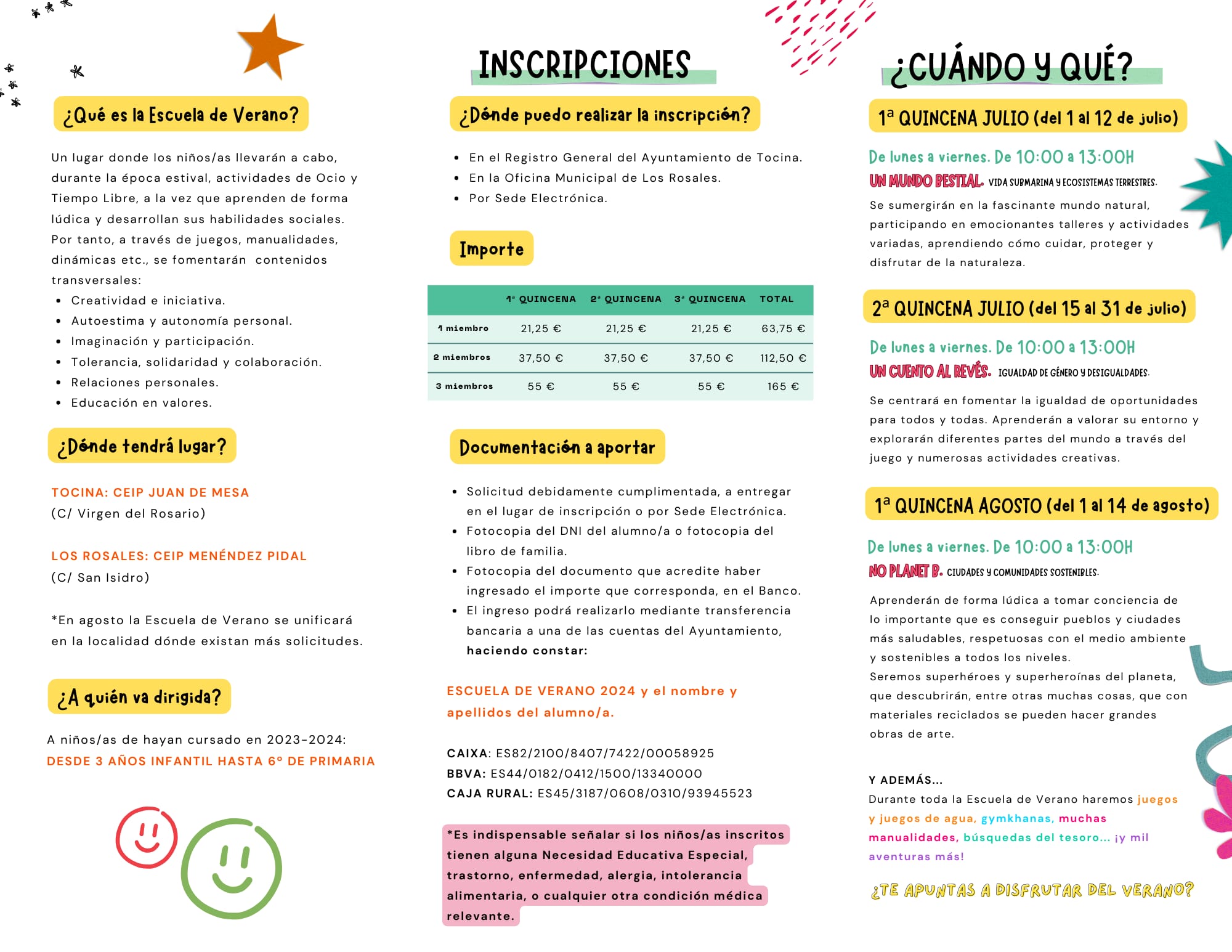 Esta actividad está dirigida a niños y niñas que hayan cursado en el año 2023-2024 Educación Infantil (desde 3 a 5 años Infantil) o Primaria (desde 1º a 6º). En esta edición cabe destacar la apuesta firme del Ayuntamiento por ofrecer una Escuela de Verano inclusiva, ofreciendo un máximo de 5 plazas para alumnado de necesidades educativas especiales de los centros educativos de la localidad.