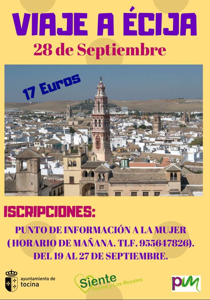 El próximo 28 de septiembre la Delegación de Mayores del Ayuntamiento de Tocina prevé la realización de una visita turística al pueblo de Écija. Este municipio es conocido como "la ciudad de las torres", por los once campanarios que emergen sobre sus tejados de tejas grises y rosadas. En la visita a Écija (Conjunto Histórico-Artístico desde 1966), se visitarán las torres de La Concepción, la Plaza Mayor, bellísimos caseríos señoriales, así como varias iglesias del municipio. La visita concluirá con un almuerzo.