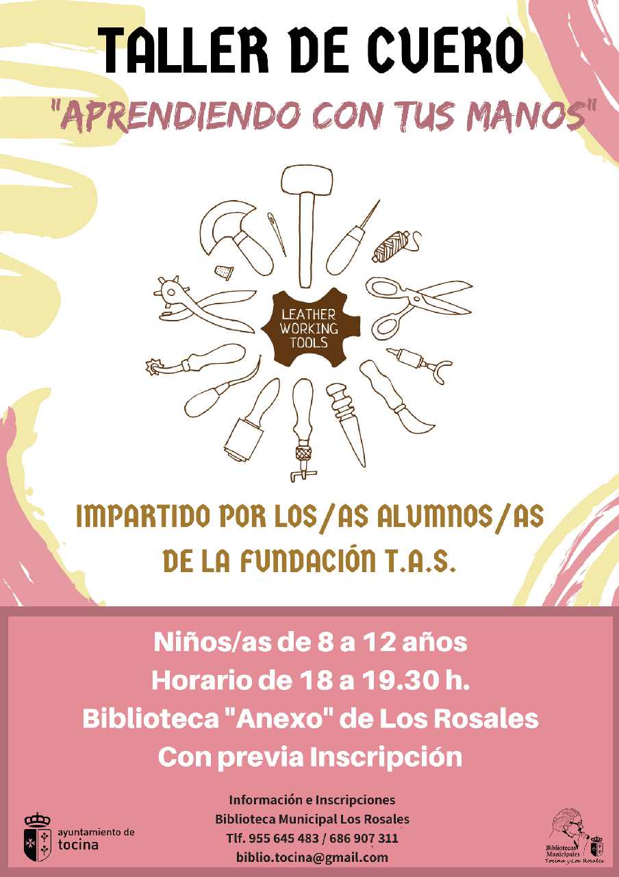 Los días 9 y 16 de octubre en horario de 18 a 19:30 h. la Red de Bibliotecas Públicas Municipales de Tocina y Los Rosales junto a la Fundación TAS de nuestro municipio organiza un taller de cuero destinado a los niños/as de entre 8 y 12 años.