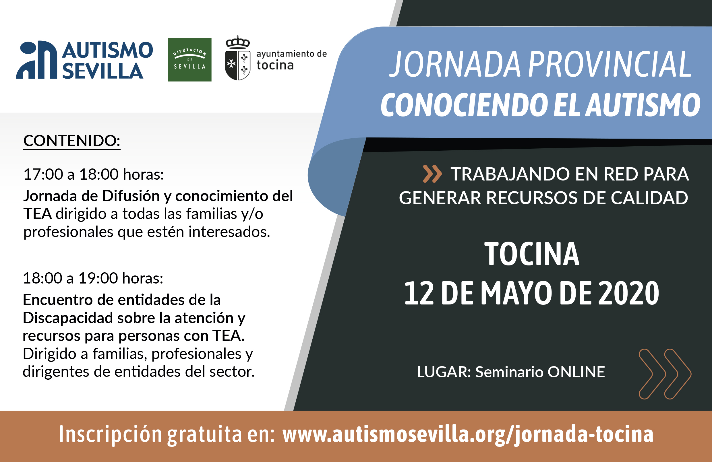 Autismo Sevilla en colaboración con el Ayuntamiento de Tocina tenía prevista la realización de unas jornadas para profesionales y familias el pasado 16 de marzo sobre el Trastorno del Espectro del Autismo (TEA). La propagación del coronavirus y las medidas tomadas para intentar aplacarlo, hicieron imposible su realización.