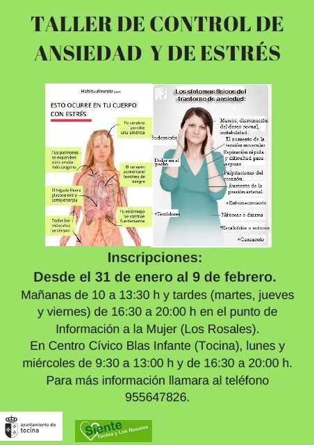La duración del taller será, en principio, de tres sesiones de 17 a 18:30 h. y se impartirán tanto en Tocina (los martes en Servicios Sociales) como en Los Rosales (los lunes en el Punto de Información a la Mujer).