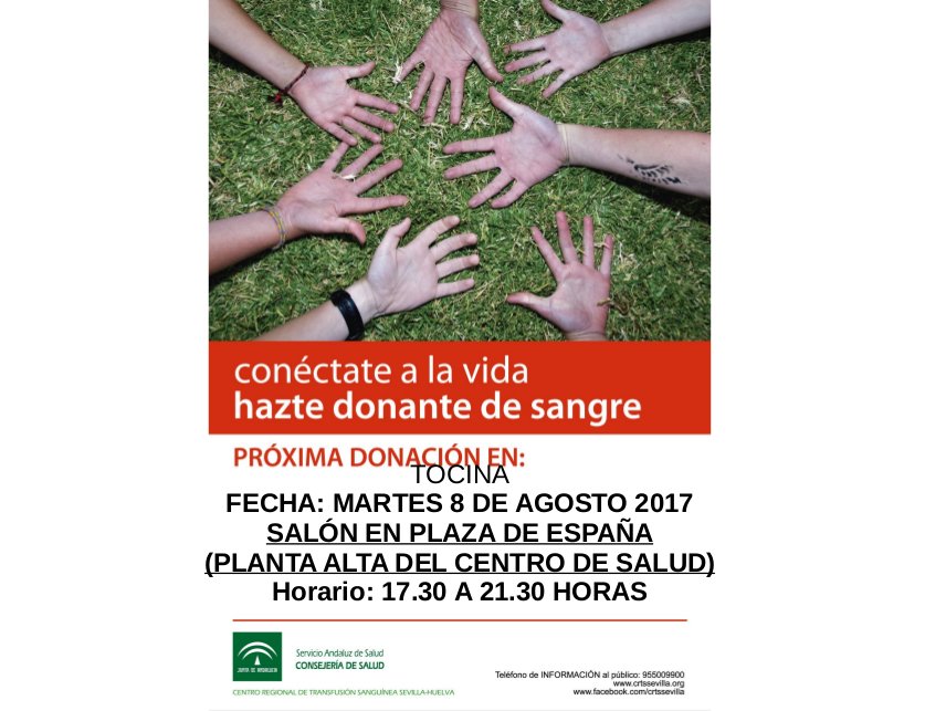 El Centro de Transfución Sanguínea informa que mañana, martes 8 de agosto, habrá una campaña de donación de sangre en Tocina y Los Rosales. Será en el local de la Plaza de España (planta alta del Centro de Salud) en horario de 17:30 a 21:30 horas. Se necesita sangre de todos los grupos sanguíneos, especialmente de los grupos 0 y A negativos.