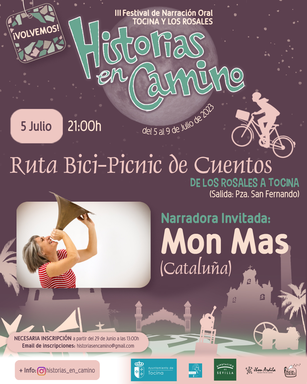 Este año, la narradora encargada de acompañar la Ruta Bici-Picnic de Cuentos será la fascinante, enérgica y deslumbrante Narradora Oral ¡Mon Más! procedente de Cataluña, quién deleitara al público asistente con cuentos cortos y largos, hechos a mano, cocinados a fuego lento para ser susurrados al oído o al pie de la bicicleta.