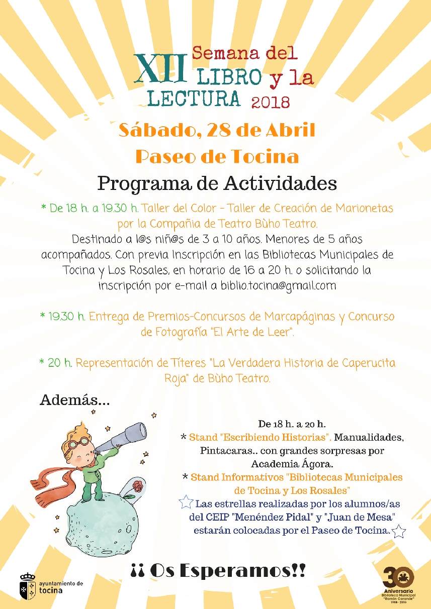 El variado programa de actividades puesto en marcha por la Delegación de Cultura del Ayuntamiento de Tocina para celebrar el Día del Libro, a través de la XII Semana del Libro y la Lectura, llega a su fin el sábado 28 de abril con una serie de actos que se realizarán en el paseo de Gran Avenida de Tocina. Desde las 18 h. a las 20 h. habra un stand, "Escribiendo Historias", que albergará manualidades y pintacaras, además de grandes sorpresas. Otro espacio informativo estará dedicado a las Bibliotecas Municipales de Tocina y Los Rosales. Además en el paseo estarán colocadas las estrellas realizadas por los alumnos/as del CEIP Menéndez Pidal y Juan de Mesa. Como actividades más destacadas se realizarán: