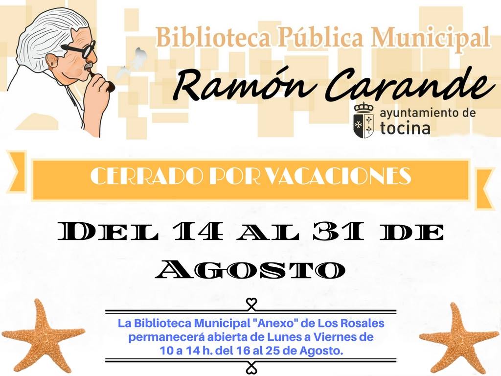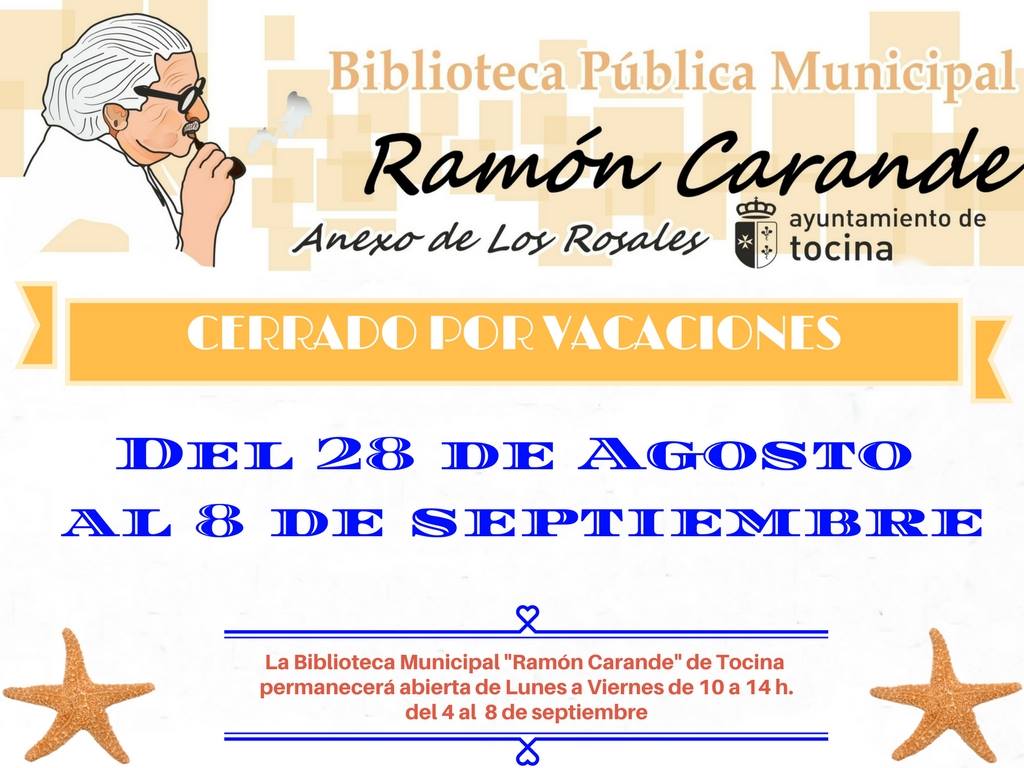 Durante este periodo de cierre de cada biblioteca, la otra permanecerá abierta en horario de 10 a 14 h., excepto la semana de Feria de Tocina y Los Rosales que ambas permanecerán cerradas, del 28 de agosto al 1 de septiembre.