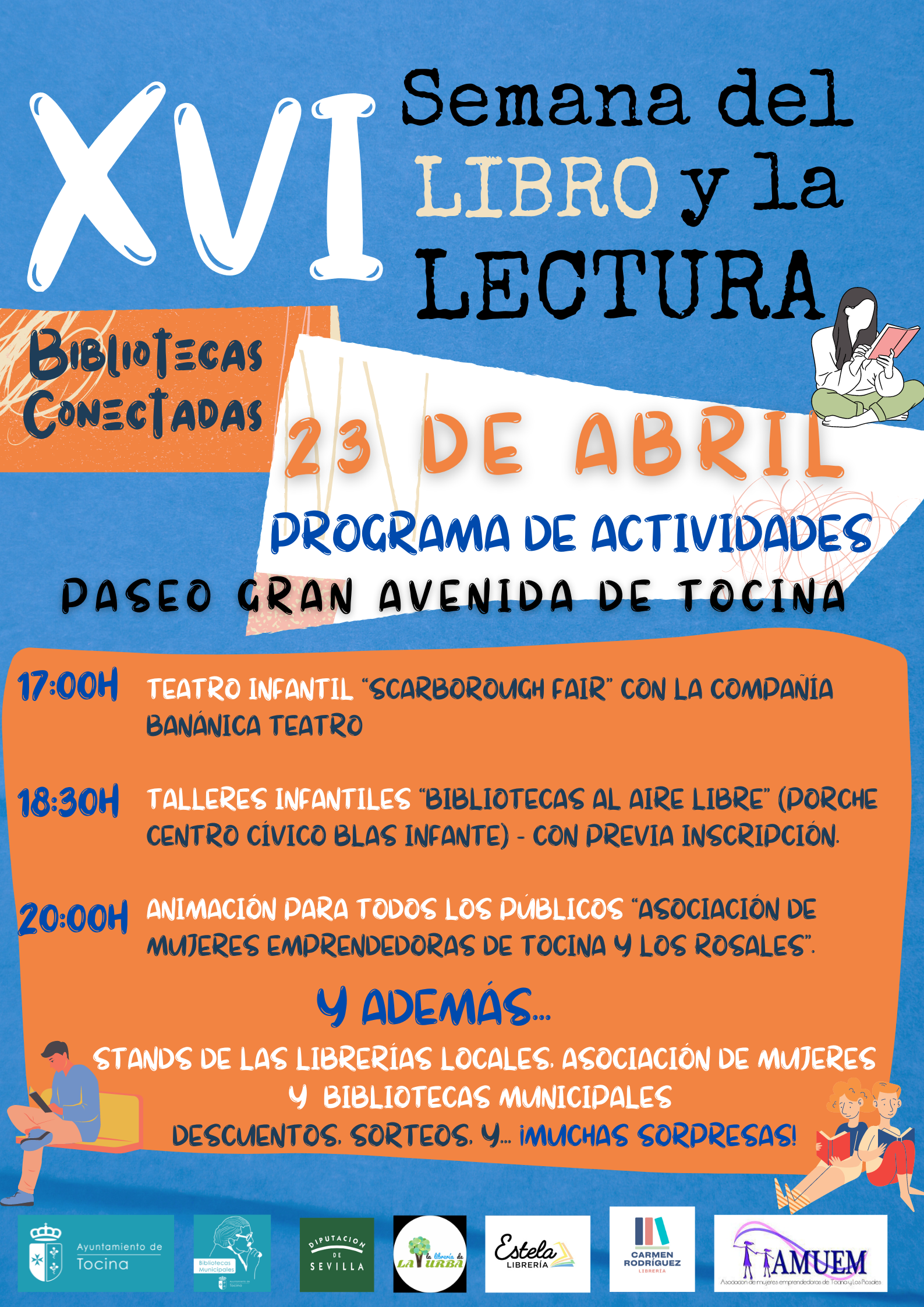 Se contará con stands de las librerías locales de Tocina y Los Rosales, pudiendo disfrutar de descuentos en la compra de libros (5%). Además, las librerías realizarán sorteos entre todas las personas que adquieran algún libro ese día.