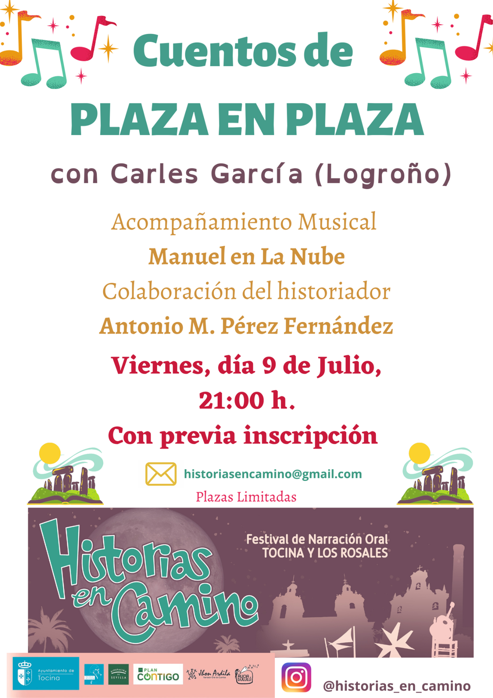 Esta actividad, denominada "Cuentos de plaza en plaza" será la primera dirigida a todos los públicos dentro del festival "Historias en camino" y se visitarán lugares emblemáticos del municipio de Tocina acompañados de la narración de historias, música, anécdotas e historia del municipio.