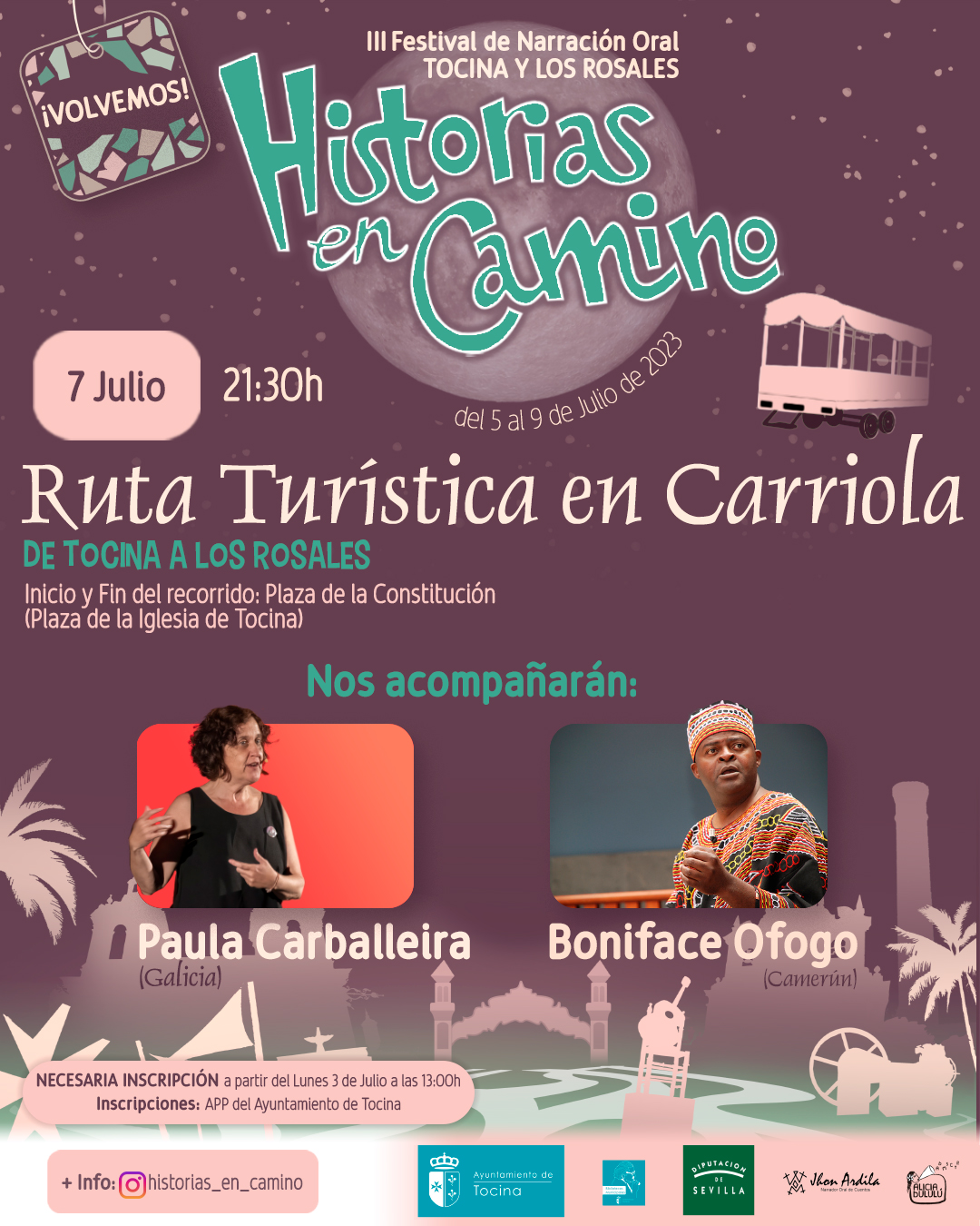 Una de las grandes sorpresas de la III edición del festival de Narración Oral de Tocina y Los Rosales es la posibilidad de dar un paseo al más puro estilo romero mientras cuentan historias. Este año el Festival «Historias en Camino» con su objetivo principal de mantener el espíritu en movimiento que viene caracterizando sus propuestas culturales que conectan, a través de las historias contadas de Tocina y Los Rosales proponen una Ruta Turística en Carriola el Viernes 7 de Julio a las 21.30h.