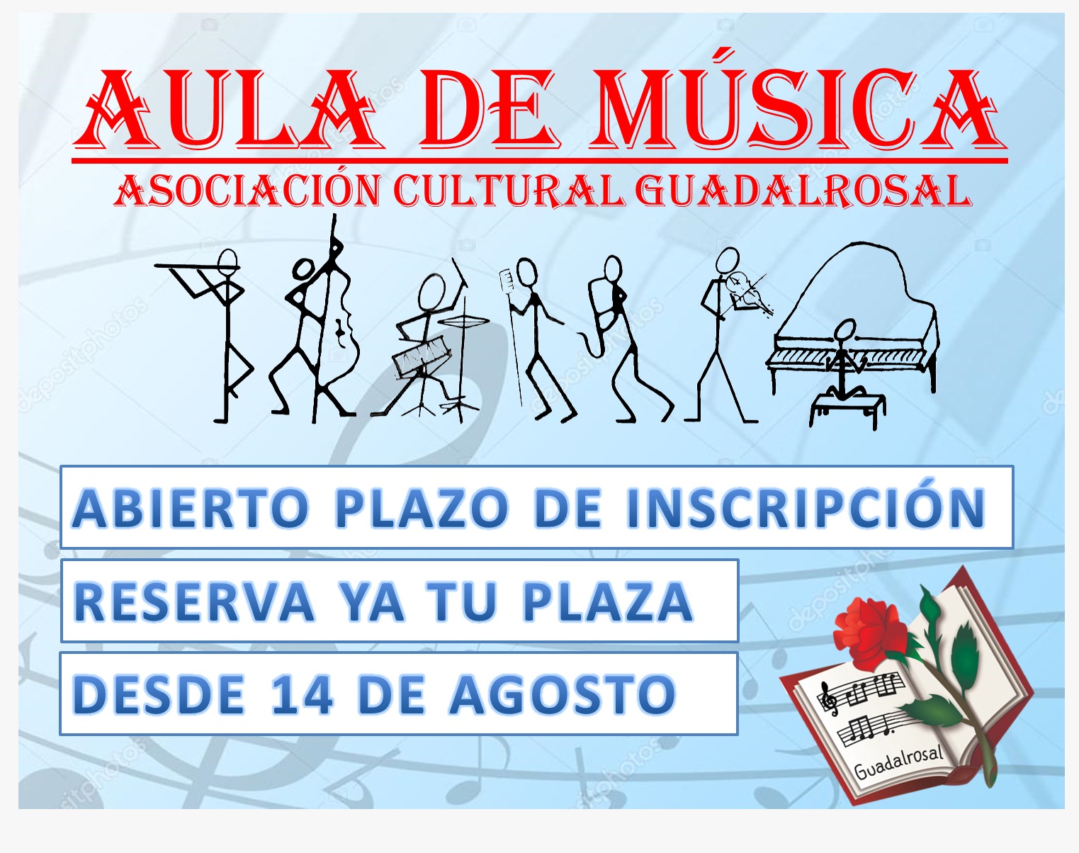 El Aula de Música de la A. C. Guadalrosal abrirá el plazo de inscripciones y matriculaciones para el nuevo curso 2017/2018. Será a partir del 14 de agosto cuando se recogerán las nuevas inscripciones para el próximo curso, que dará comienzo en septiembre.