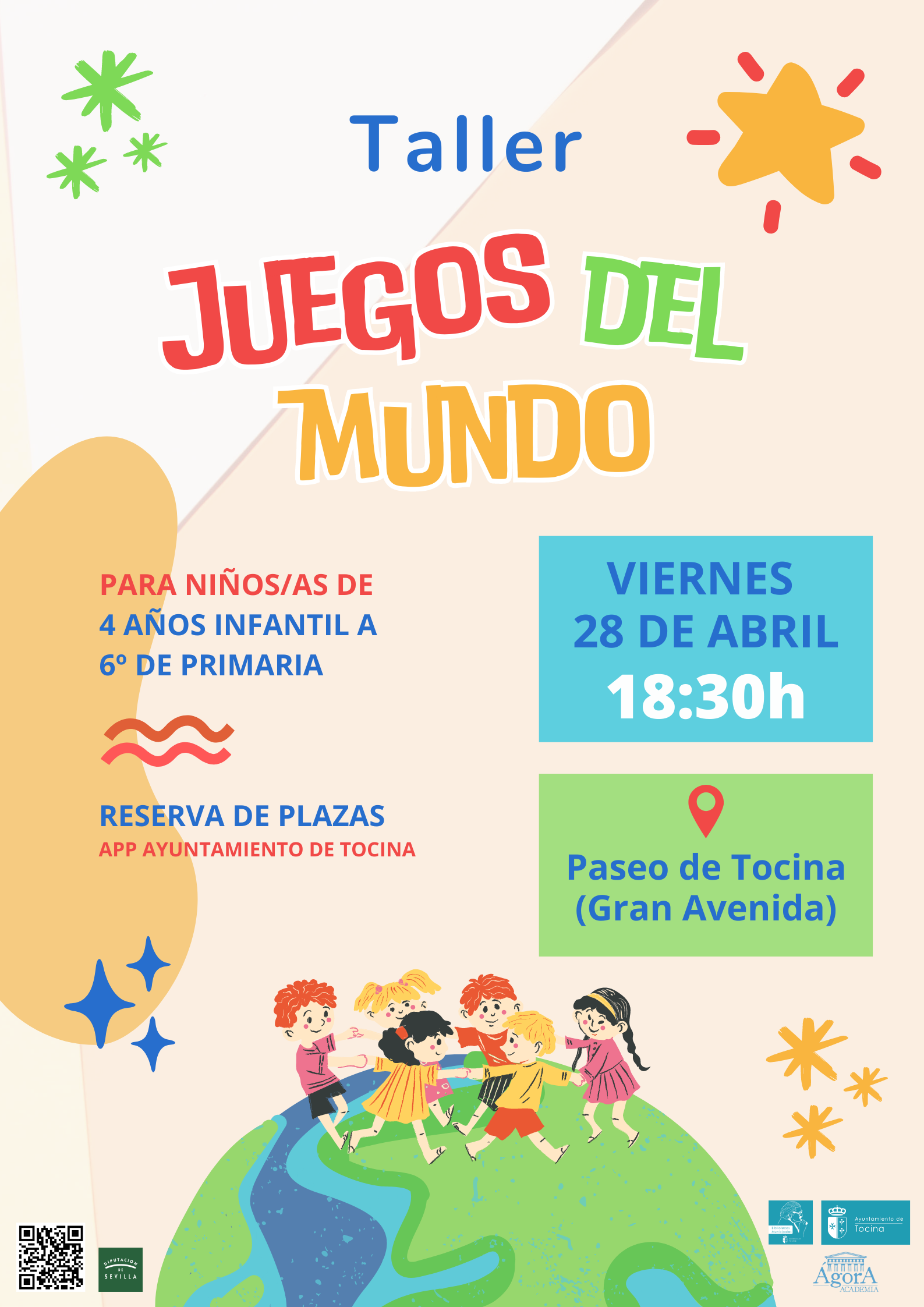 El taller “Juegos del mundo”, realizado por Academia Ágora, tendrá lugar el viernes 28 de abril a las 18:30 h. en el patio del Centro Cívico Blas Infante (Gran Avenida), y está destinado a niños de 4 a 12 años (4 años Infantil a 6º de Primaria).