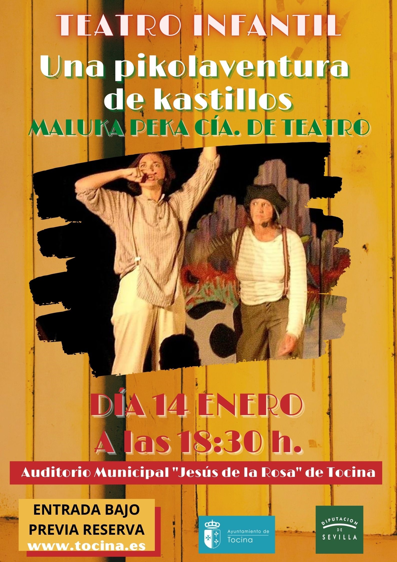 La Delegación de Cultura del Ayuntamiento de Tocina ofrece al municipio el teatro infantil “Una pikolaventura de kastillos”, el próximo 14 de enero en el Auditorio Municipal Jesús de la Rosa Luque, a las 18:30 h.