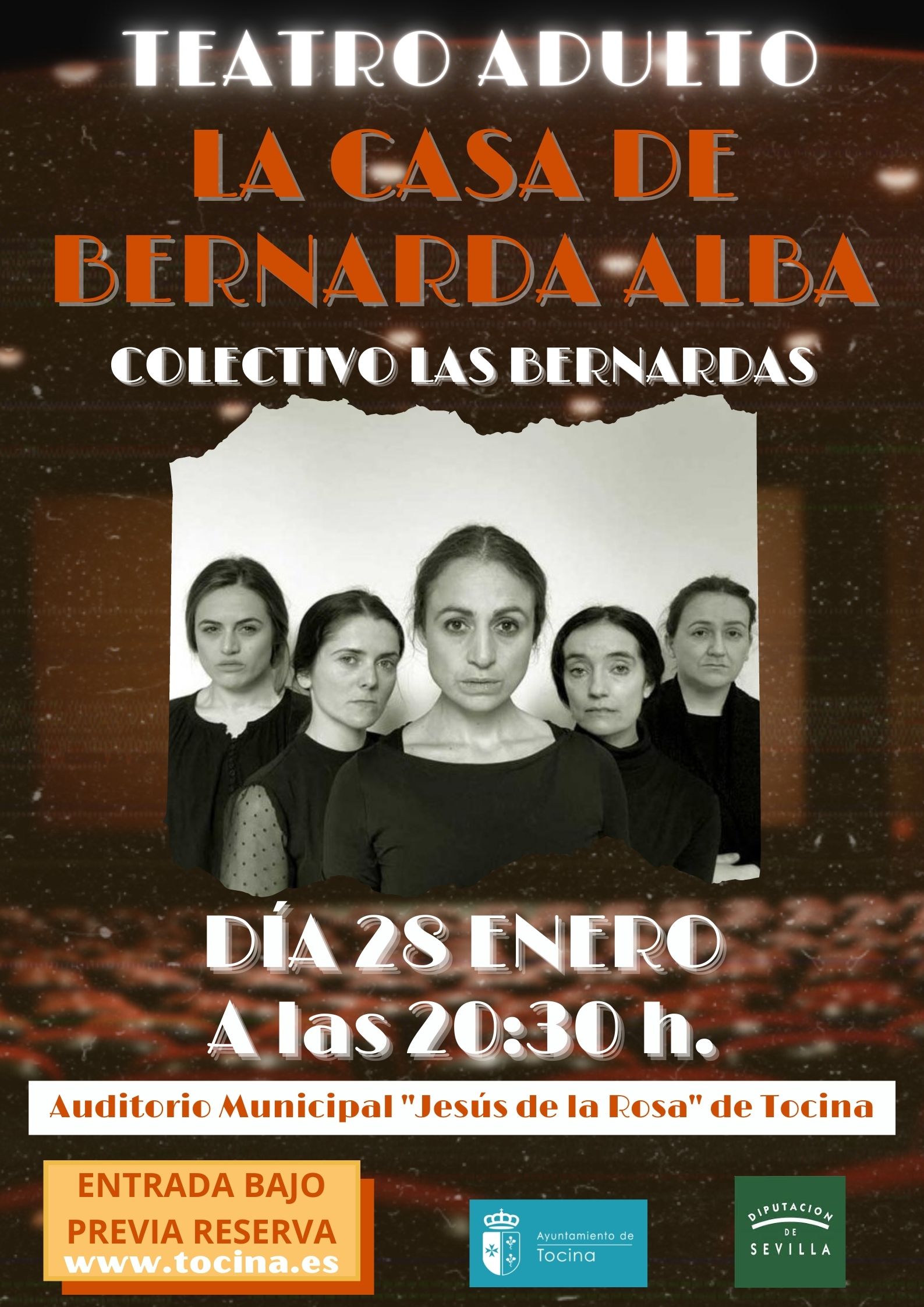 La Delegación de Cultura del Ayuntamiento de Tocina ofrece al municipio la representación teatral “La casa de Bernarda Alba”, el próximo 28 de enero en el Auditorio Jesús de la Rosa Luque, a las 20:30 h.