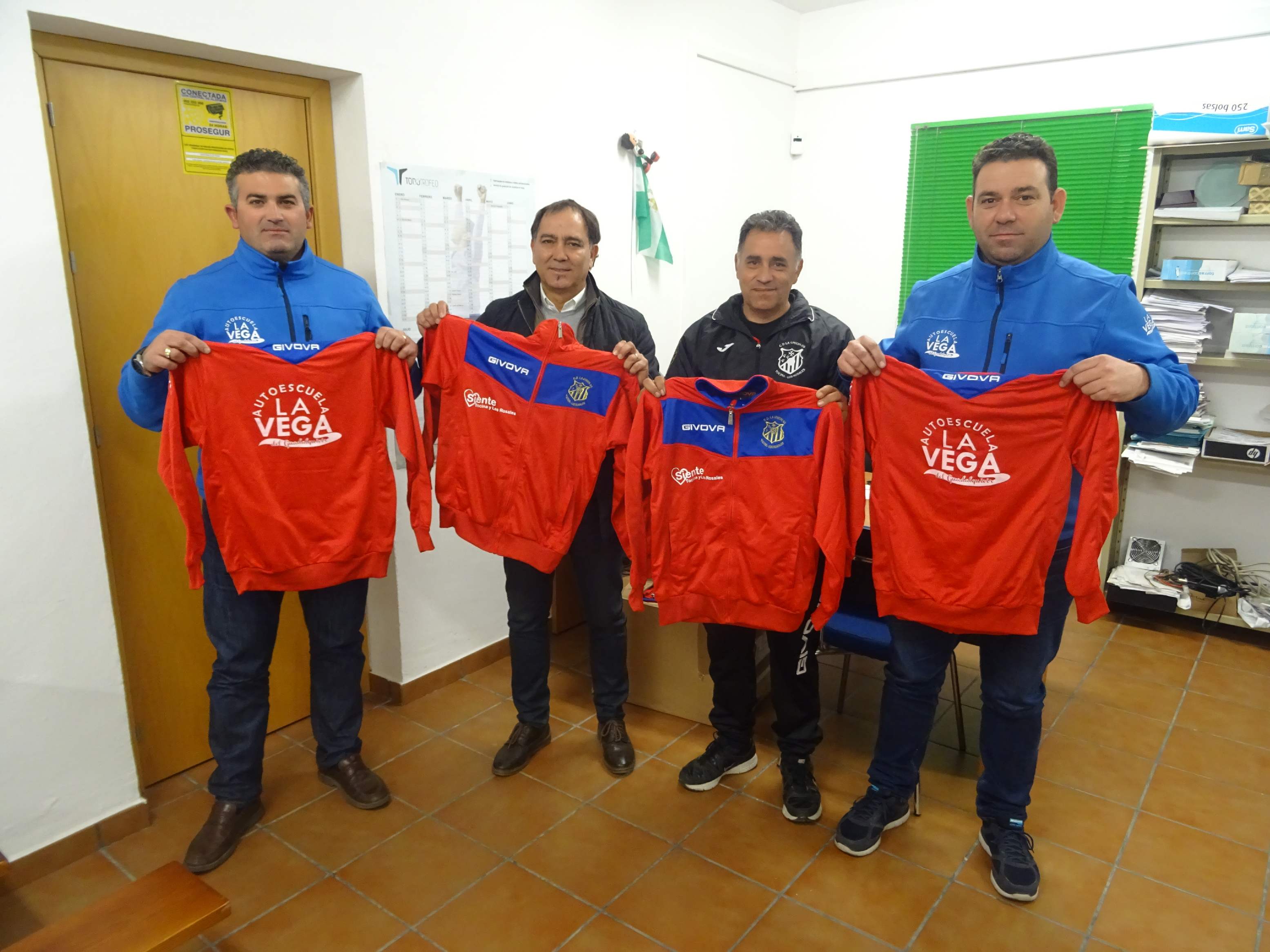 Los chándals en la parte frontal lucen el escuedo del Club Deportivo La Unión-08 y el logo Siente Tocina y Los Rosales, y en la parte trasera el logo de la empresa local Autoescuela "La Vega del Guadalquivir", copatrocinador junto con el Ayuntamiento de Tocina del lote de prendas deportivas.