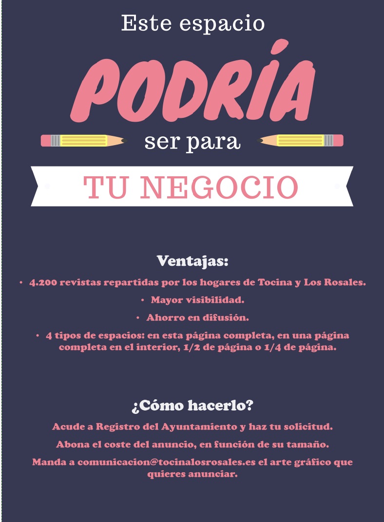 Si tienes un negocio y deseas captar más clientela, una buena oportunidad es anunciarte en la revista municipal de carácter mensual "Siente Tocina Los Rosales".