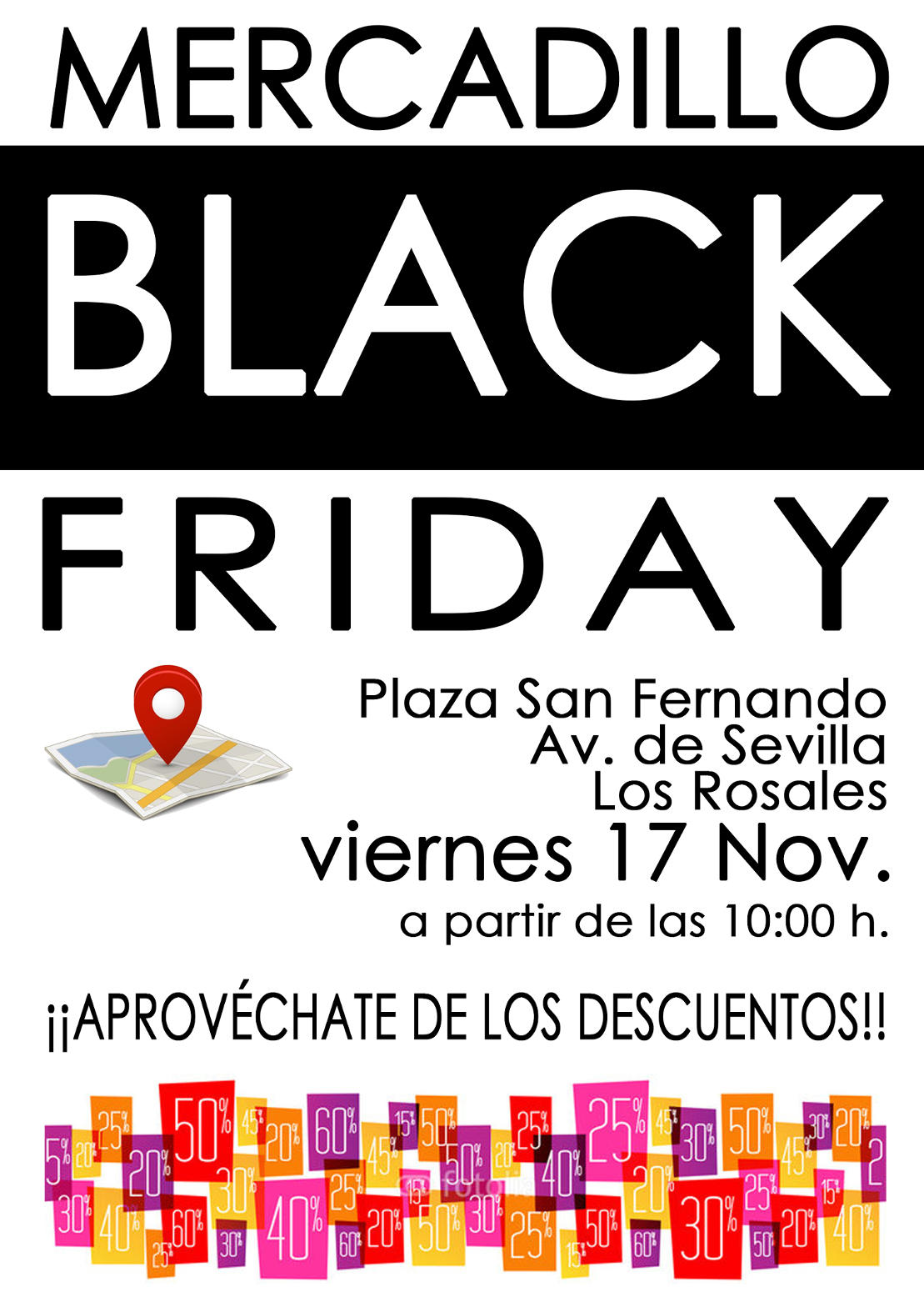 Hoy, 17 de noviembre, desde las 10 h. de la mañana y en horario ininterrumpido hasta las 20 h., los comercios de Los Rosales trasladan su negocio, con motivo del llamado Black Friday, a la Plaza San Fernando y Avenida de Sevilla.