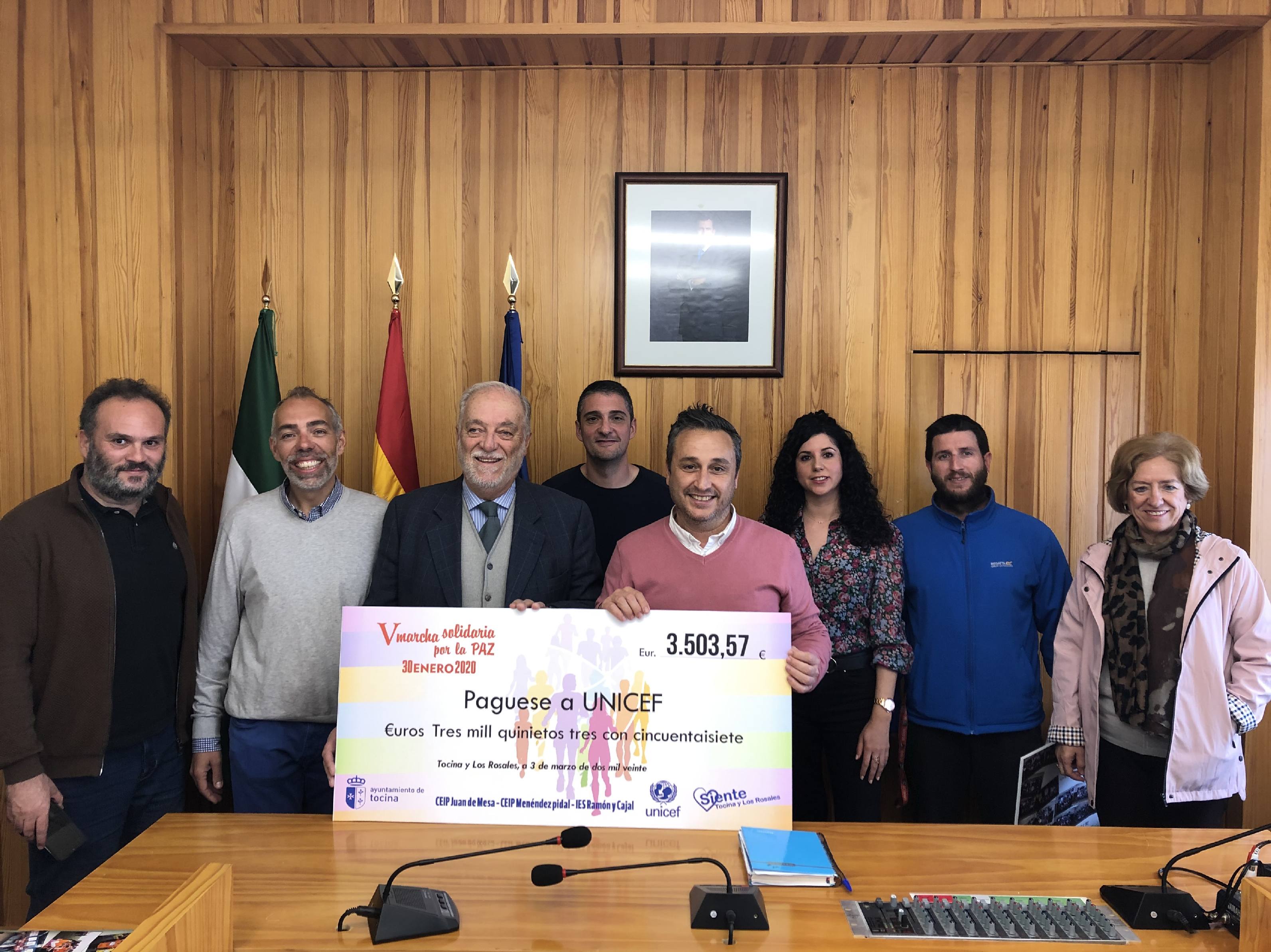 En un acto celebrado en la casa consitorial en la tarde de ayer, el Ayuntamiento de Tocina hizo entrega a UNICEF, ONG colaboradora en la organización de la V Marcha Por la Paz el pasado 30 de enero, de un simbólico cheque con la cantidad ingresada a favor de esta ONG por parte de las familias de Tocina y Los Rosales, cantidad que asciende a 3.503,57 €.
