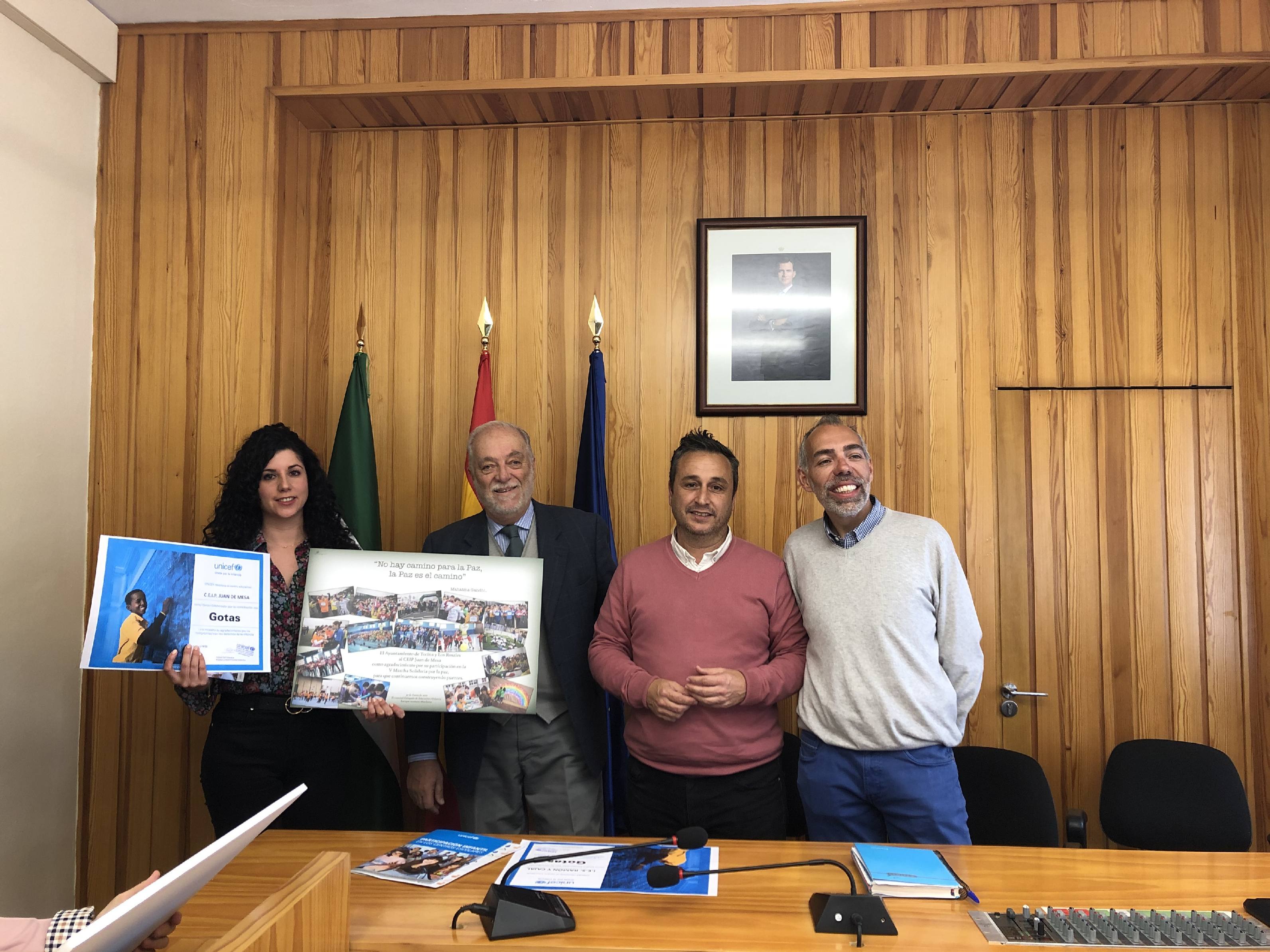 Hizo entrega en nombre del Ayuntmaiento del cheque el primer edil, Francisco José Calvo, que estuvo acompañado por Enrique Aceituno, concejal de Educación, quienes además hicieron entrega de unas fotografías conmemorativas de la Marcha Solidaria a los jefes de estudios de los CEIP Juan de Mesa y Menéndez Pidal, así como a los responsables de "Escuela Espacio de Paz" del IES y del Menéndez Pidal.