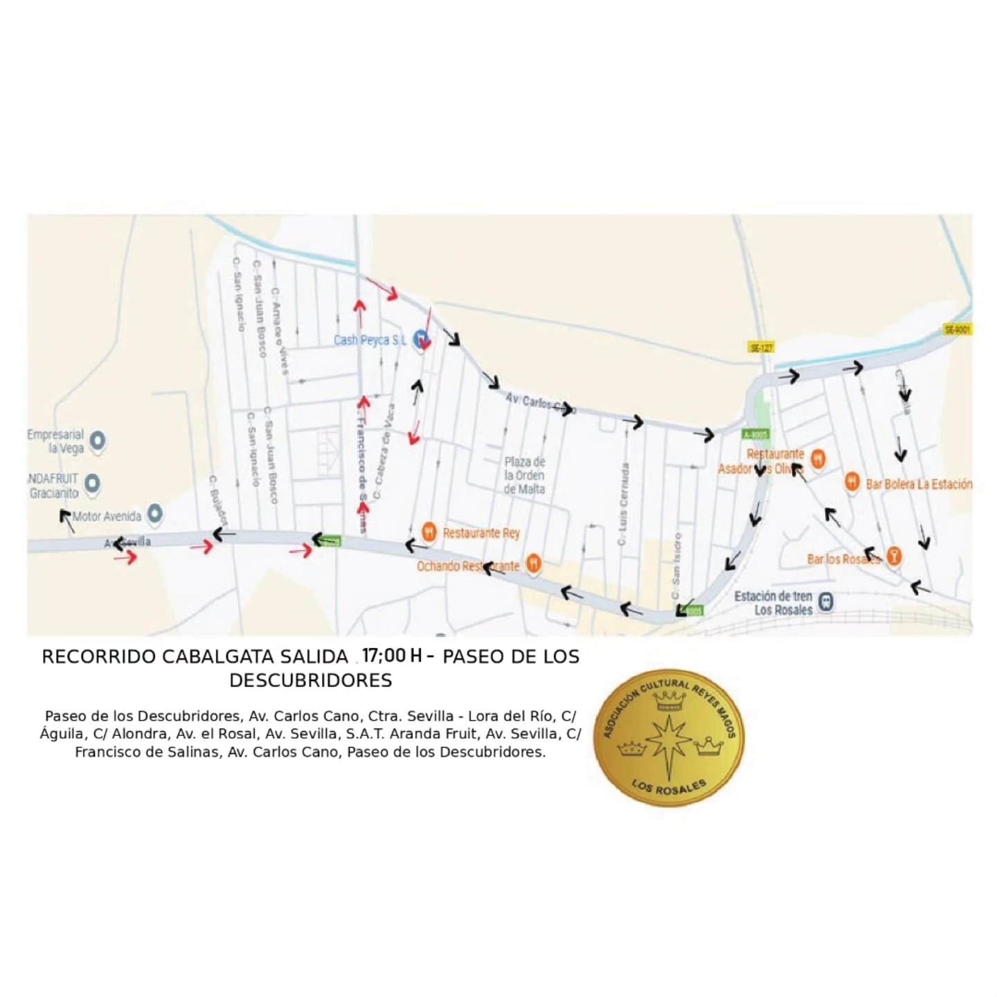 Así, en Los Rosales comenzarán los actos a las 16 h. con la adoración al Niño Jesús en la Parroquia Ntra. Sra. de Fátima. La comitiva Real entrará por la calle San Isidro, teniendo su salida por la calle Virgen de Fátima, iniciando el recorrido del pasacalles (16:30 h.) que los llevará hasta el Paseo de los Descubridores, siguiendo estas calles: Virgen de Fátima, Avda. de Sevilla, Jazmín, Plaza Orden de Malta, Gladiolo, Legazpi, Vasco Núñez de Balboa y Paseo de los Descubridores. Desde allí a las 17 h. saldrá la cabalgata 2025, cuyo recorrido se puede ver en la imagen inferior.
