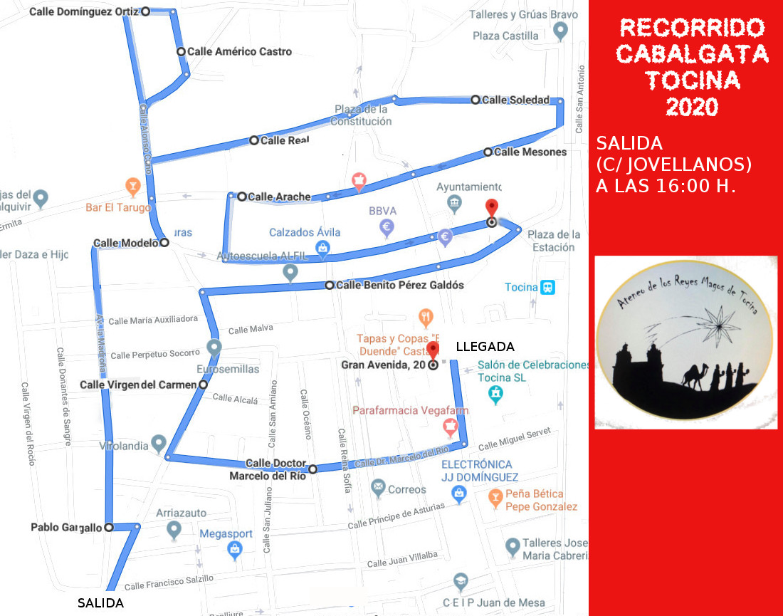 Vuelve un 5 de enero, víspera del Día de Reyes, y Tocina y Los Rosales organiza dos cabalgatas que repartirán ilusión a los niños y niñas de nuestro municipio. En el núcleo de Tocina el Ateneo informa que el día 5 de enero, a las 16 horas, saldrá la cabalgata desde la nave del Ateneo en calle Jovellanos, nº 1, (junto a Frutas Aranda). El recorrido será similar al de años precedentes: calle Pablo Gargallo, Avda. La Madroña, Modelo, Alonso Cano, Los Portales, Américo Castro, Domínguez Ortiz, Los Portales, Real, Soledad, Mesones, Hospital, Arache, Rey Juan Carlos I, Plaza de España, Dr. Sopeña, Julio Caro Baroja, Benito Pérez Galdós, Virgen del Carmen, Dr. Marcelo del Río y finalización en Gran Avenida.