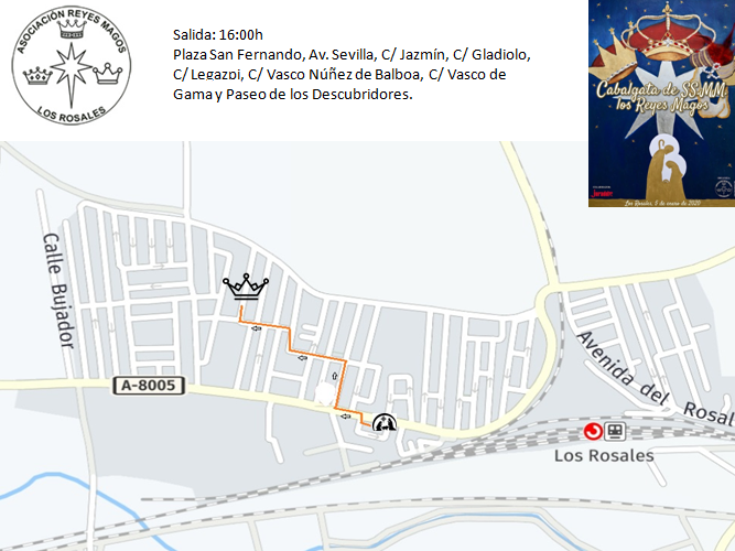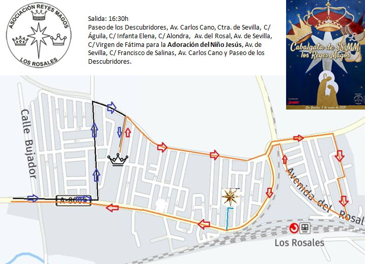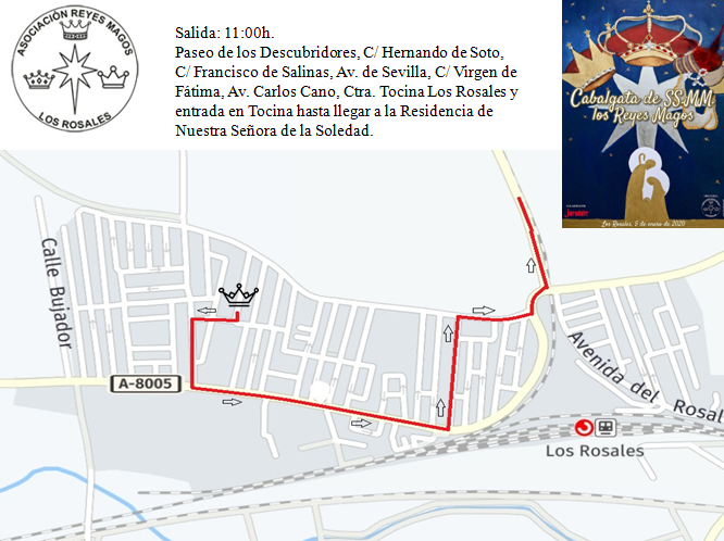 Por su parte en Los Rosales tendrán como primera misión, a las 11 h., visitar a los abuelitos y abuelitas que viven en la residencia de Ntra. Sra. de la Soledad de Tocina, repartiendo los primeros regalos a los niños/as que no se encuentren con facultades de verlos en la calle. Ya por la tarde podremos saludarlos en la Plaza San Fernando a las 16 h., donde se formará el cortejo que los llevará a cada uno de los tronos, ubicados en el Paseo de los Descubridores, desde donde saldrán las carrozas a las 16:30 h. por Avda. Carlos Cano en dirección al barrio de La Estación (carretera de Sevilla, calles Águila, Infanta Elena, Alondra y Avda. El Rosal). Volverán por Avenida de Sevilla, con parada en la iglesia parroquial para la Adoración al Niño y tras llegar a Las Arenas regresarán por Fco. de Salinas al Paseo de los Descubridores para finalizar su recorrido.
