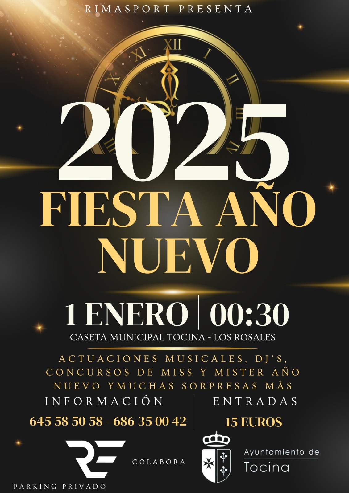 La fiesta contará con DJ’s, concursos de miss y mister “Año Nuevo” y muchas sorpresas más. Organiza RimaSport, con la colaboración del Ayuntamiento de Tocina.