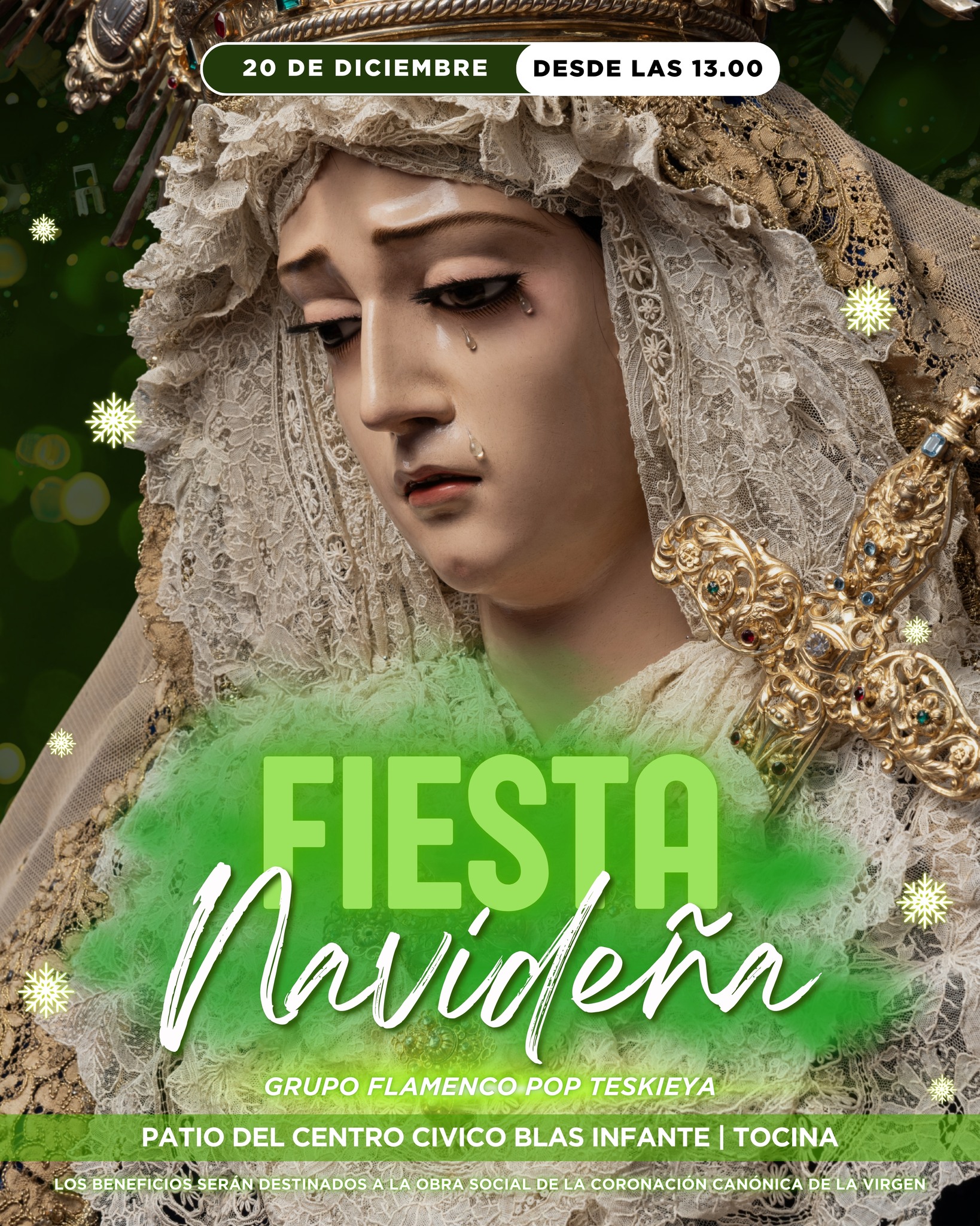 El próximo sábado, 20 de diciembre, a partir de las 13:00 h, la Hermandad de la Vera-Cruz realizará en las recién remozadas instalaciones municipales del patio del Centro Cívico Blas Infante, una fiesta navideña. Los beneficios económicos recaudados en la misma irán destinados a la Obra Social de la Coronación Canónica de la Santísima Virgen de la Soledad en sus Dolores.
