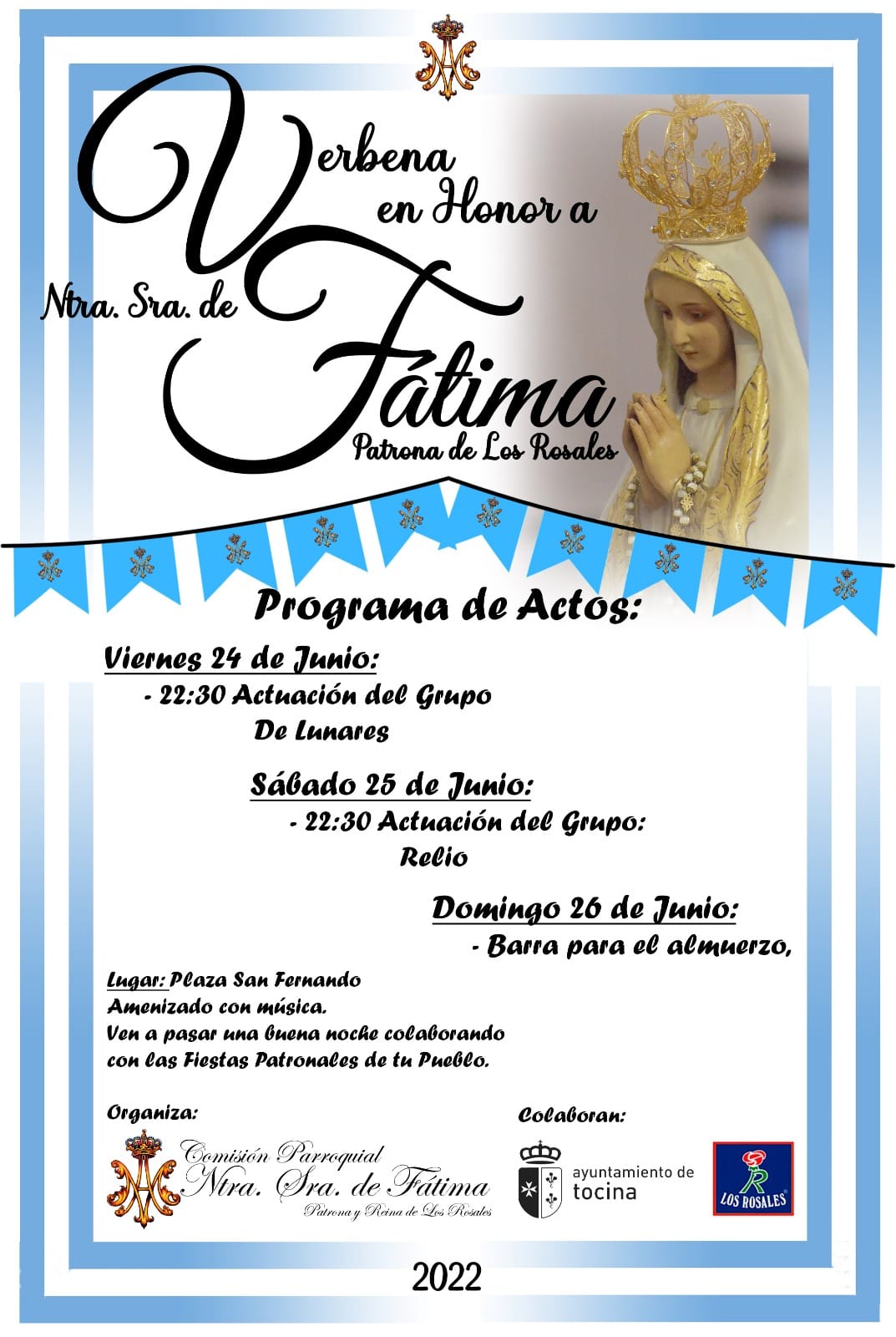 La Comisión Parroquial de Ntra. Sra. de Fátima de nuestros municipio organiza los próximos días 24, 25 y 26 de junio la tradicional verbena en honor a Ntra. Sra. de Fátima de Los Rosales.