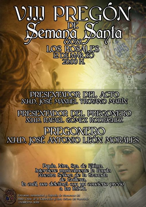 Será este sábado día 12 de marzo a las 20 h. en la Iglesia Parroquial Ntra. Sra. de Fátima. El acto contará con el acompañamiento musical de la Banda de la Granada de Guillena, que amenizará la espera con un concierto previo desde las 19:30 h.