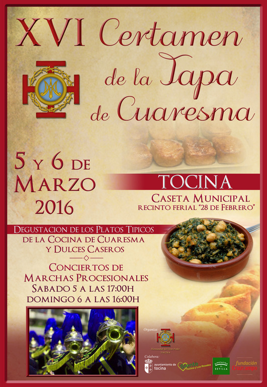 Con más de tres lustros celebrándose, el certamen de tapa de cuaresma está sin duda más que afianzado en el calendario de eventos gastronómicos de la provincia de Sevilla. Como en años anteriores, en la Caseta Municipal del Recinto Ferial 28 de Febrero, se podrá degustar una gran variedad de tapas, realizadas desinteresadamente por vecinos/as de Tocina y Los Rosales, tanto por Hermanos/as como por no Hermanos/as. El denominador común: las tapas no utilizan la carne entre sus ingredientes. También se podrán degustar dulces típicos de Semana Santa. Para amenizar el certamen se realizarán conciertos de marchas procesionales. Este año asistirán la Banda CCTT Entre Azahares (Dos Hermanas) que será la encargada de acompañar en la próxima madrugá al paso del Gran Poder, la Agrupación Musical de Peñaflor y la Asociación Musical de La Algaba, que como lleva haciendo en los últimos años, pondrá los sones detrás del palio de la Virgen del Mayor Dolor y Traspaso. Los conciertos comenzarán el sábado a las 17 h. y el domingo a las 16 h.
