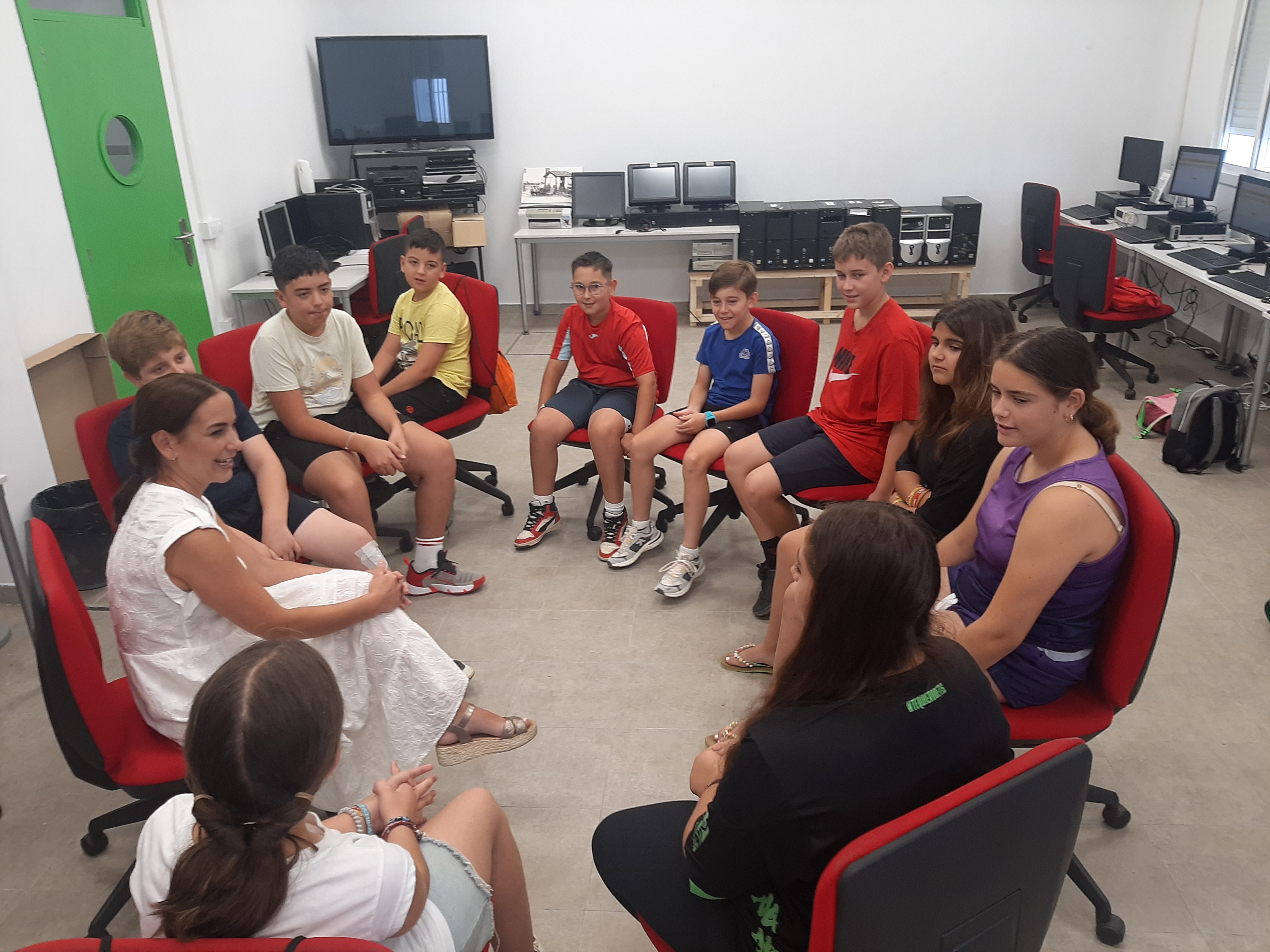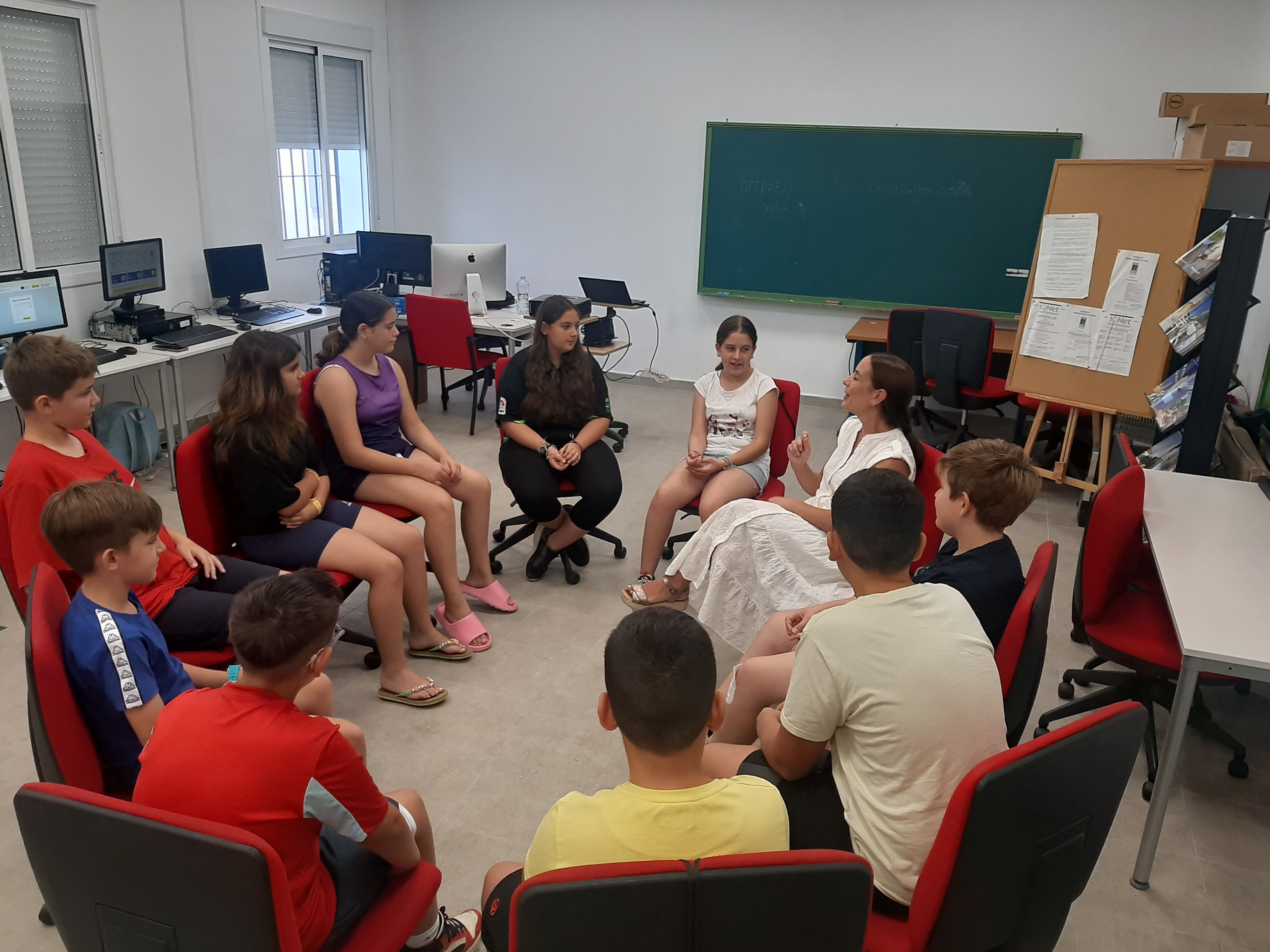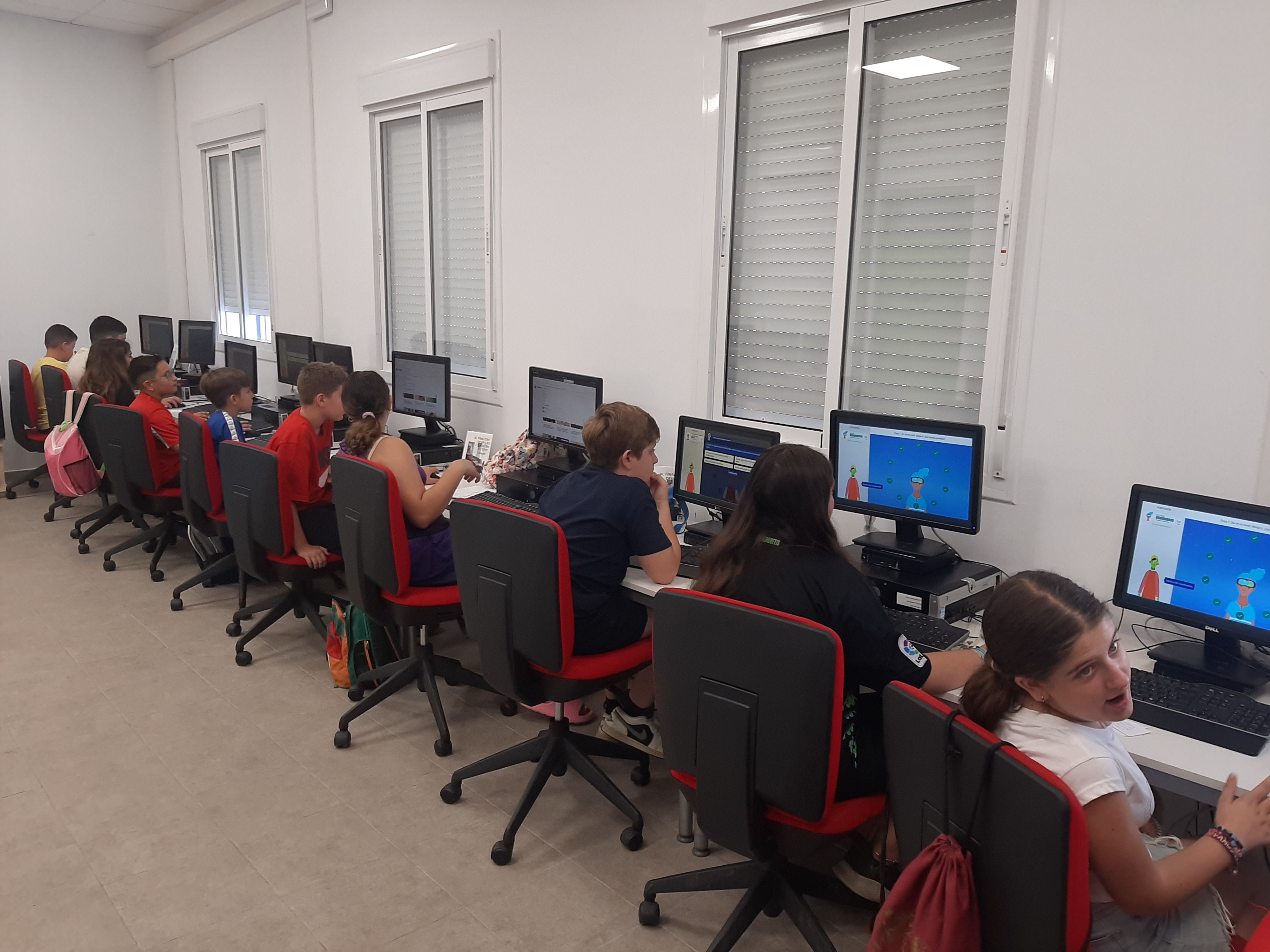 Un año más el centro Guadalinfo organiza durante los meses de verano cursos para niños teniendo como novedad esta edición la colaboración con la Fundación Cibervoluntarios. El primero de los grupos, diez niños y niñas de entre 9 y 13 años, desarrolla su formación durante esta semana. Se trata de un grupo intensivo que obtendrá el certificado DigComp de competencias digitales en solo una semana. El lunes próximo comenzará la formación de otro grupo intensivo pero de niños con edades de 14 a 17 años. Estos dos primeros grupos disfrutan de un descanso para el desayuno en el centro de ocio, aprovechando para jugar en el mismo, como puede verse en las imágenes.