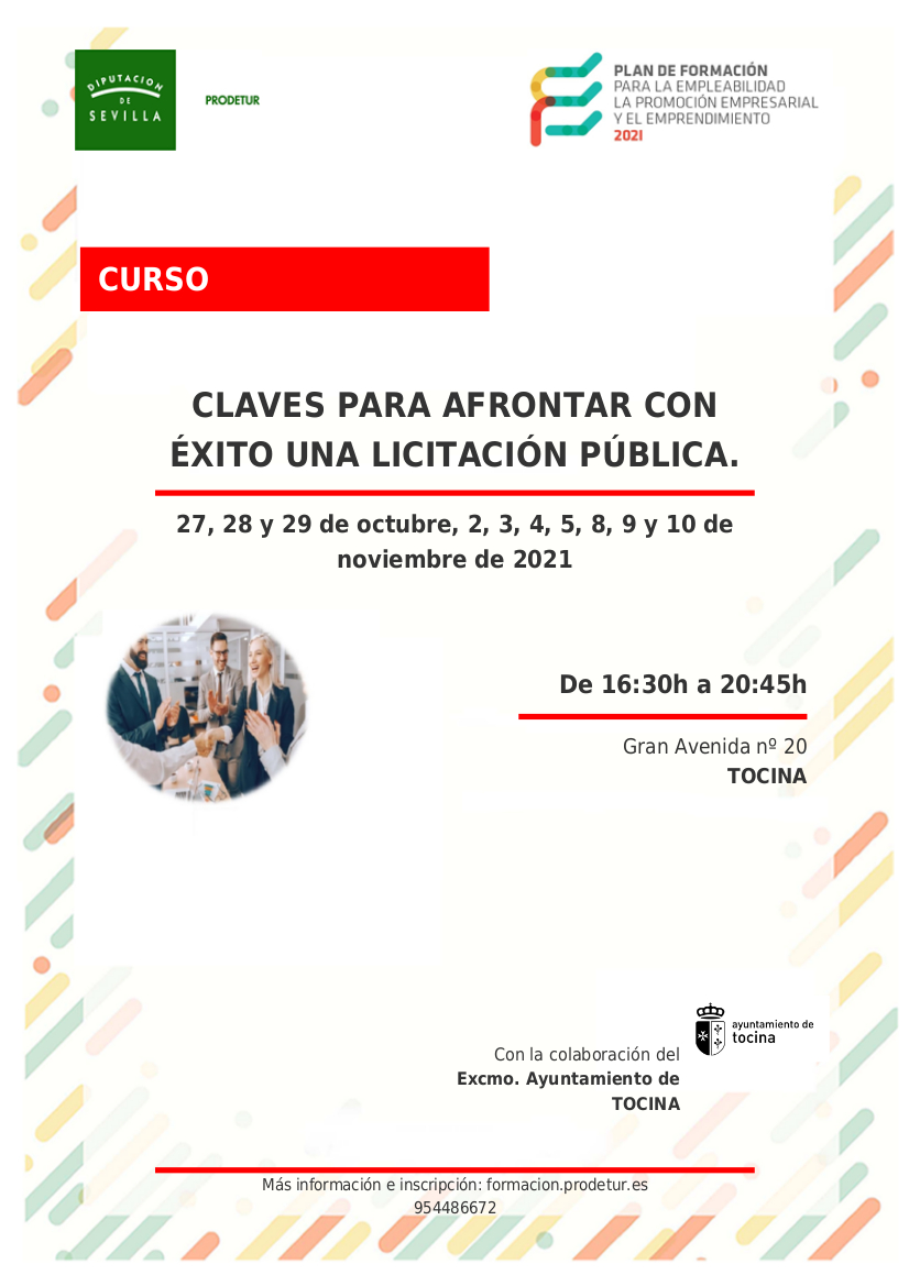 Hasta el 20 de octubre pueden solicitar la realización del curso presencial "Claves para afrontar con éxito una licitación pública", organizado por Prodetur en colaboración con el Ayuntamiento de Tocina. Dirigido a personas empresarias y profesionales por cuenta propia o ajena que deseen mejorar sus habilidades de gestión, actualizar conocimientos, modernizar sistemas y/o afrontar nuevas líneas de negocio, así como personas desempleadas que necesiten optimizar su capacidad profesional y empleabilidad. Con los conocimientos del curso se pretende proporcionar claves prácticas para participar con éxito en una licitación pública. Se aprenderá a elaborar correctamente las ofertas en los aspectos administrativos y técnicos, incluyendo elaboración de: DEUC, inscripción en registro de licitadores, solvencia técnica y económica, ofertas económicas y propuestas técnicas, y cualquier otra información que sirva para afrontar cualquier proceso de licitación con plenas garantías de que la documentación presentada cumple todos los requisitos exigidos en los pliegos y de que la elaboración de la oferta es la más ventajosa posible. Recordamos que la licitación es un sistema por el que los ayuntamientos, y otras administraciones, adjudican la realización de una obra o un servicio a la persona o la empresa que ofrezca las mejores condiciones, por lo que conocer el proceso de licitar gracias a este curso se convierte en una herramienta más que recomendable para afrontar con éxito este proceso de selección.