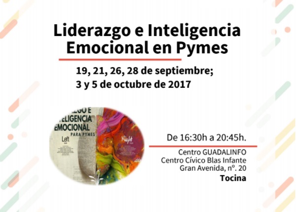 El plazo de inscripción en el Curso de Liderazgo e Inteligencia Emocional en Pymes finaliza el día 10 de septiembre. Dicho curso está organizado por la Diputación de Sevilla, a través de su sociedad Prodetur y tendrá lugar los días 19, 21, 26, 28 de septiembre; 3 y 5 de octubre de 16:30 a 20:45 h., en el Centro Guadalinfo de Tocina.