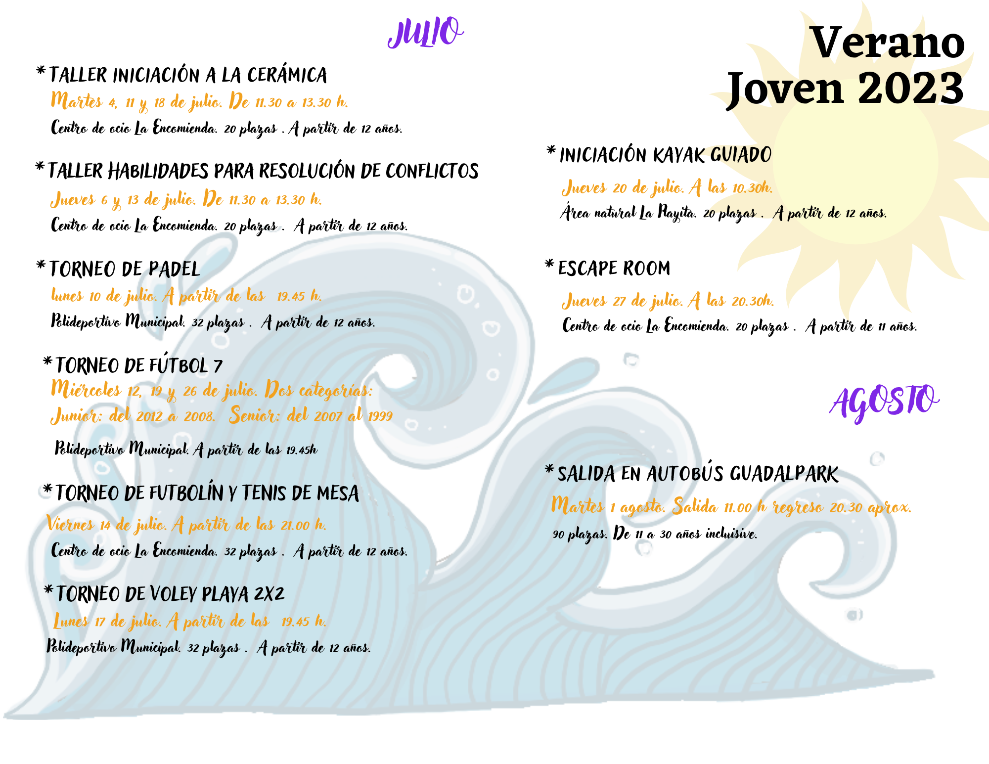 - Torneo de Fútbol 7. Miércoles 12, 19 y 26 de julio. A las 19.45h . Polideportivo. Categoría Junior: personas nacidas del 2012 al 2008 inclusive. Senior: personas nacidas desde el 2007 al 1999. Los equipos pueden ser de 9 personas máximo. Premio para los equipos ganadores. Vale de 120 euros por equipo.