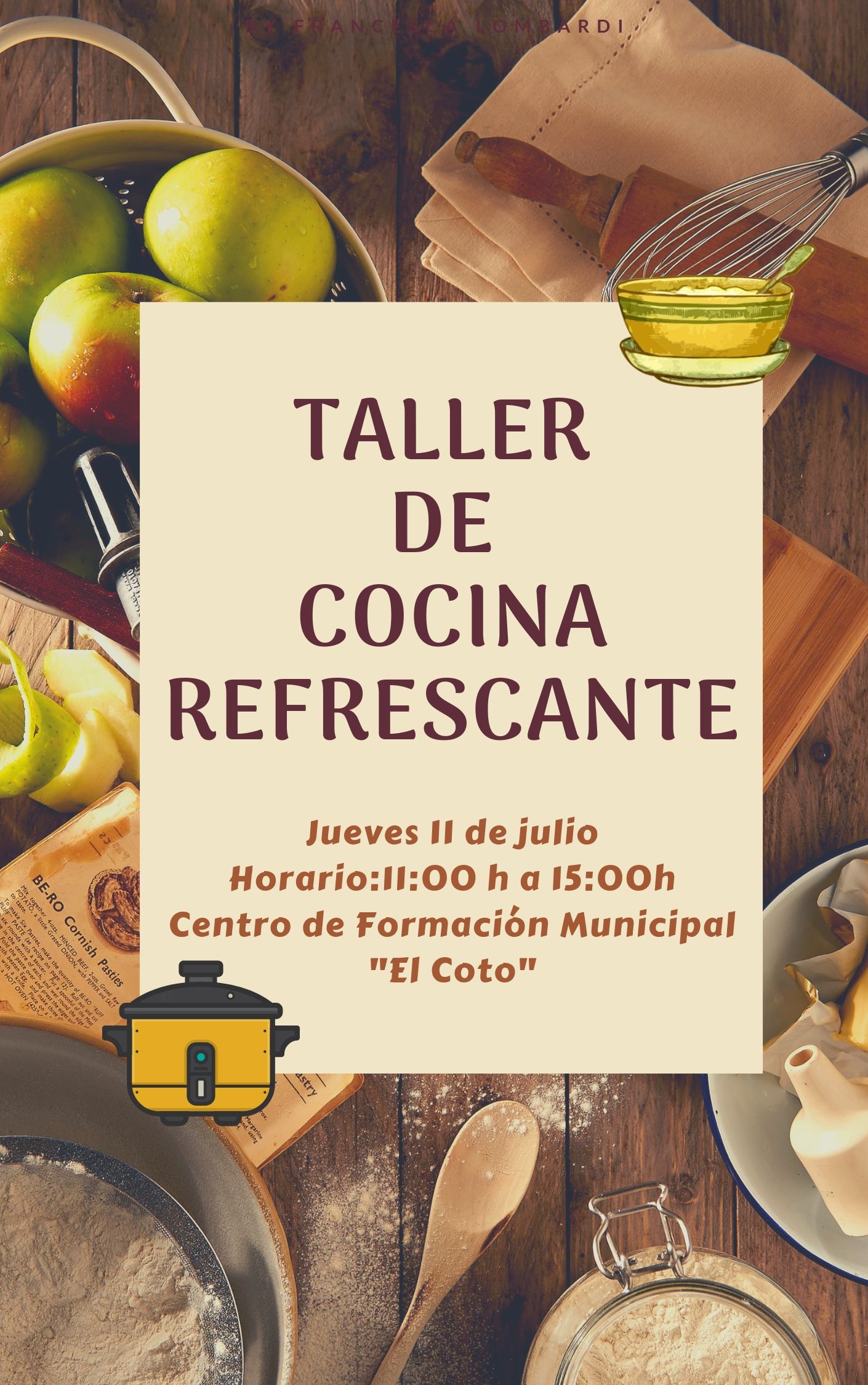 El próximo jueves 11 de julio en horario de 11 a 15 h. tendrá lugar en el Centro de Formación Municipal “El Coto”, el Taller de Cocina Refrescante. En éste pueden participar jóvenes de Tocina y Los Rosales con edades comprendidas entre los 12 y los 30 años; siendo 20 el número de plazas disponibles.