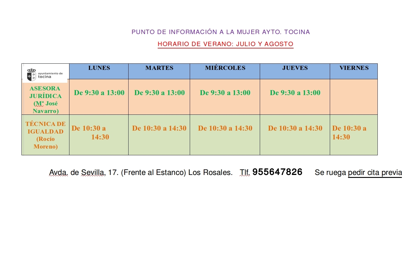 Como todos los años, el Punto de Información a la Mujer modifica su horario durante los meses de julio y agosto. Para estos meses estivales el horario de atención será sólo de mañanas, quedando el servicio cerrado por lastardes. A continuación adjuntamos un cuadrante detallado del horario de atención tanto de la Asesora Jurídica (Mª José Navarro) como de la Informadora y Técnica de Igualdad (Rocío Moreno).