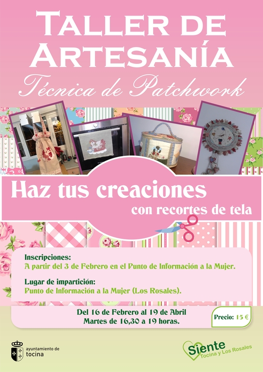 La Delegación de Igualdad del Ayuntamiento de Tocina programa un taller de patchwork, que tiene previsto su comienzo el 16 de febrero y su finalización el 19 de abril. Se trata de una técnica de artesanía textil que consiste en hacer originales diseños con la unión de fragmentos de telas. Con esta técnica se pueden hacer muy diversos artículos como pueden ser edredones, cuadros, bolsos, etc. La duración del taller será de 10 sesiones de 2 horas y media, un día a la semana, en principio los martes de 16:30 a 19 h. El coste del taller será de 15 euros. Las personas interesadas pueden dirigirse al Punto de Información a la Mujer (Avda. de Sevilla, 17), pudiendo realizar la inscripción a partir del 3 defebrero.